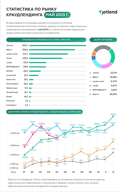 Результаты платформы за май 2025: основные показатели JetLend и рынка краудлендинга России. В мае 2025 года инвесторы JetLend поддержали 49 займов на сумму 405,7 млн рублей. За все время работы платформа помогла 3 863 компаниям на общую сумму 30,77 млрд рублей. Рыночная доходность на платформе в мае достигла 32,1% (XIRR). Для сравнения, средняя ставка по банковским депозитам (RUONIA) была 20,8%. Уровень риска в системе по новой модели (NPL 15+) составил 5,5%. За период с 1 августа 2020 года по 30 мая 2025 года инвесторы получили процентный доход в размере 3,55 млрд рублей. Источник: www.jetlend.ru