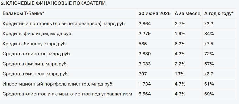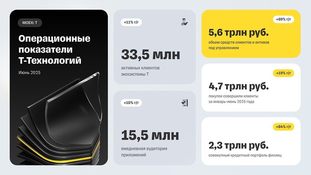 Группа «Т-Технологии» раскрывает операционные результаты за июнь 2025 г. Международная компания публичное акционерное общество «Т-Технологии» (MOEX: Т), технологическая компания, развивающая финансовую и лайфстайл экосистему, объявляет сокращенные операционные результаты деятельности за июнь 2025 г. Операционные показатели и финансовые метрики рассчитаны по внутренней методологии и не полностью отражают результаты работы всей Группы. Консолидированная отчетность Группы по МСФО за II квартал 2025 г. будет раскрыта в августе 2025 г. Общее количество клиентов экосистемы Т выросло на 16% год к году и достигло 51,7 млн. Количество активных пользователей экосистемы Т увеличилось на 11% год к году и составило 33,5 млн. Общий объем покупок клиентов Т за январь—июнь 2025 г. вырос на 19% год к году и превысил 4,7 трлн руб. Кредитный портфель составил 2,9 трлн руб., увеличившись на 2,7% за месяц Объем средств клиентов и активов под управлением на счетах клиентов достиг 5,6 трлн руб., увеличившись на 69% год к году. Президент Т-Технологий Станислав Близнюк: «В первой половине 2025 года мы видим продолжающийся тренд на рост транзакционной активности наших клиентов: общий объем покупок клиентов за январь—июнь превысил 4,7 трлн рублей — на 19% больше по сравнению с первой половиной прошлого года. Дополнительным стимулом для роста объемов транзакций внутри экосистемы Т становятся наши ИИ-ассистенты, работающие по модели агентов - то есть позволяющие совершать покупки прямо в приложении. Недавно мы запустили собственного ИИ-агента в одном из самых популярных у клиентов Т лайфстайл-сервисах — Путешествиях. На конец июня клиенты доверили нам 5,6 трлн руб. собственных средств и активов, этот показатель продемонстрировал рост на 69% год к году. Лояльность клиентов к экосистеме Т также подтверждается ростом числа продуктов на клиента и эффективностью наших механик кросс-продаж. Группа продолжает эффективно использовать высвобождающийся капитал в рамках перераспределения активов в более высокодоходные направления, с запасом выполняя все требования регулятора в части достаточности капитала банковского бизнеса, в том числе с учетом всех существующих, а также планируемых буферов. Финансовые результаты Т-Технологий по МСФО за II квартал и первое полугодие 2025 года мы опубликуем в августе, сохраняя планы объявлять о дивидендах каждый квартал. Ближайшие дивиденды владельцы акций Т получат на следующей неделе — 33 рубля на акцию по результатам I квартала. При этом мы продолжаем соблюдать баланс между инвестициями в рост, диверсификацией бизнеса и возвратом капитала акционерам. Это находит отражение в предпочтениях частных инвесторов: акции Т четвертый месяц подтверждают топ-4 позицию в народном портфеле Московской биржи». Общее число клиентов экосистемы Т увеличилось на 16% год к году и достигло 51,7 млн человек. Число активных клиентов, которые пользуются нашими сервисами хотя бы раз в месяц, выросло на 11% за год и составило 33,5 млн человек. Количество активных пользователей приложений в месяц (MAU) увеличилось на 11% год к году до 33,5 млн человек. Количество активных пользователей приложений в день (DAU) выросло на 10% год к году до 15,5 млн человек. Общий объем покупок клиентов Группы за январь—июнь 2025 г. составил более 4,7 трлн руб., увеличившись на 19% год к году. Консолидированный кредитн