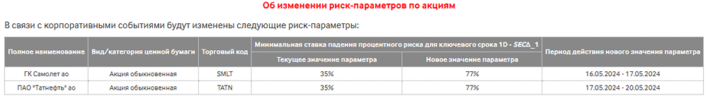 Новость: нейтральная. Об изменении риск-параметров по акциям. В связи с корпоративными событиями будут изменены следующие риск-параметры. Источник: www.moex.com