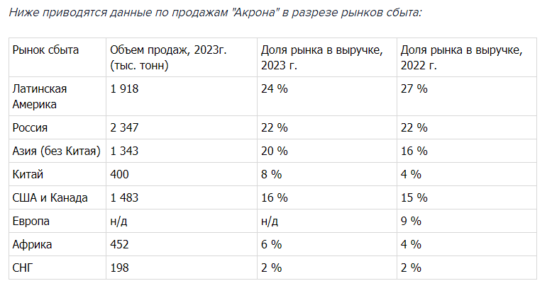 Новость: нейтральная. Акрон в 2023 году почти прекратил поставки в Европу, перенаправил объемы в Азию и Америку. "Акрон" в 2023 году почти полностью прекратил поставки в Европу и Великобританию, говорится в проекте годового отчета компании. "С учетом санкционных ограничений, введенных в 2022 году против Российской Федерации, деятельность торговой компании Acron Trading Switzerland AG была заморожена. Поставки в Европу практически прекращены. Цепочки поставок в другие страны были перестроены, и теперь поставки осуществляются либо через независимых трейдеров, либо напрямую конечным покупателям", - сообщается в документе. Почти полностью остановлены продажи и британским потребителям, уточняет "Акрон". На европейский рынок ранее приходилось около 13% выручки "Акрона" (объем продаж в 2020 году – 0,9 млн тонн). Компания поставляла туда как удобрения (карбамид, аммиачную селитру, карбамидо-аммиачную смесь (КАС), NPK), так и сырье – аммиак и апатитовый концентрат (по контракту с бельгийской Prayon). Крупнейшими покупателями продукции "Акрона" в регионе были Нидерланды, Финляндия, Литва, Норвегия, Эстония и Великобритания. Поставки в Европу для "Акрона" осложнились еще в 2019 году, когда Еврокомиссия ввела антидемпинговые пошлины на импорт КАС из России. "Акрон" пытался оспорить пошлины, но ЕС отказал в пересмотре этого решения. Компания в результате прекратила поставки КАС в Европу, а в 2022 году, с введением Евросоюзом квот на ввоз калийсодержащих удобрений из России, сократила и продажи сложных удобрений. Доля европейского рынка в структуре выручки "Акрона" в 2022 году упала до 9%. В 2023 году компания увеличила поставки продукции, которая ранее отгружалась в том числе в Европу, на альтернативные рынки. Так, выросли продажи КАС в Аргентину, США и Канаду, карбамида и аммиачной селитры - в Латинскую Америку, NPK-удобрений - в Индию и Китай, говорится в проекте годового отчета. Тем не менее, общий объем продаж "Акрона" снизился на 0,3 млн тонн - до 8,3 млн тонн. На Латинскую Америку, основной экспортный рынок для "Акрона", в прошлом году пришлось 24% выручки компании (объем продаж - 1,9 млн тонн, +6% год к году). В частности, "Акрон" начал поставки в регион кальциевой селитры: на Латинскую Америку в 2023 году пришлось 28% от всего объема продаж этого продукта. Азиатский рынок, без учета Китая, в 2023 году обеспечил 20% выручки группы (объем продаж составил 1,35 млн тонн, из них почти 1 млн тонн - в Индию). Индия в прошлом году стала крупнейшим экспортным направлением поставок NPK-удобрений "Акрона": на нее пришлось 32% от всех продаж. Доля Китая, традиционного рынка сбыта NPK, в выручке "Акрона" достигла 8%. В 2023 году "Акрон" обеспечил четверть всего импорта NPK в Китай, пишет компания в отчете. Доля США и Канады в выручке "Акрона" за прошлый год составила 16% (объем поставок - 1,5 млн тонн). На этот регион пришлось 87% от общего объема продаж КАС, а также 35% продаж карбамида группы. Поставки в Африку обеспечили 6% выручки "Акрона" за прошлый год. Основными покупателями продукции группы в регионе были Марокко, Кения и Гана. Африка - крупнейший регион сбыта кальциевой селитры для группы (42% от всего объема продаж). Доля российского рынка в структуре выручки "Акрона" в 2023 году осталась на уровне предыдущего года - 22% (объем поставок - 2,35 млн тонн). Внутренний рынок стал крупнейшим для группы по сбыту аммиачной селитры и третьим - по NPK (49% и 17% 