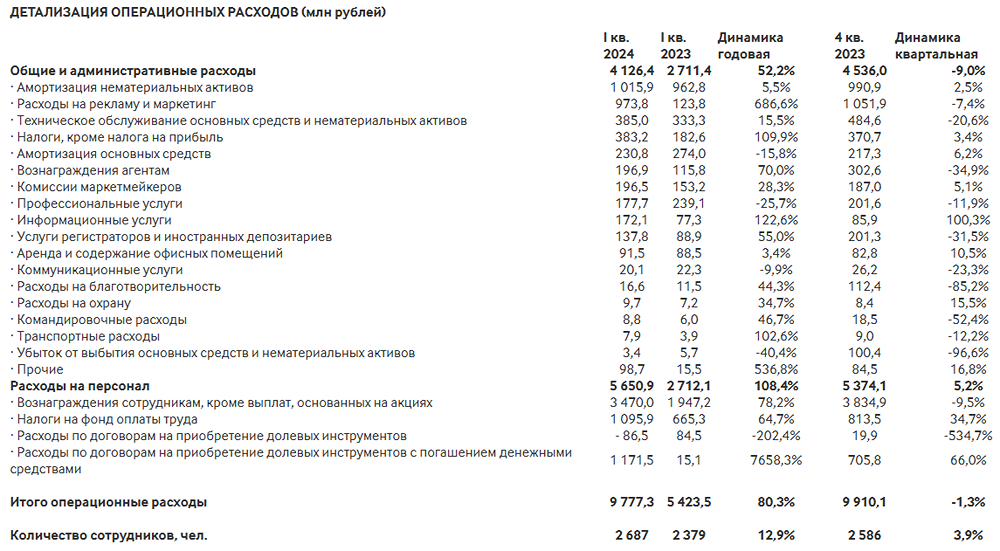 Московская биржа объявляет финансовые результаты за первый квартал 2024 года. ПАО Московская Биржа (MOEX) объявляет о финансовых результатах первого квартала 2024 года на основе сводной финансовой отчетности по МСФО. Если не указано иное, то все показатели даны за первый квартал 2024 года, а динамика (изменения в процентах) – по сравнению с первым кварталом 2023 года. ОСНОВНЫЕ ФИНАНСОВЫЕ РЕЗУЛЬТАТЫ ПЕРВОГО КВАРТАЛА 2024 ГОДА. Комиссионный доход составил 14,53 млрд рублей. Доходы от платформы Финуслуги выросли до 775,1 млн рублей. Операционные расходы снизились на 1,3% по сравнению с предыдущим кварталом. Соотношение расходов и доходов составило 28,7%. Скорректированная чистая прибыль составила 19,34 млрд рублей. ВАЖНЕЙШИЕ СОБЫТИЯ ПЕРВОГО КВАРТАЛА 2024 ГОДА. Четыре новых эмитента провели IPO на Московской бирже; объем привлеченных средств составил 22,6 млрд рублей. 30 новых акций, не имеющих листинга на бирже, стали доступны в режиме внебиржевых сделок с центральным контрагентом. Общее число доступных акций без листинга – 58. Расширился спектр деривативов на глобальные бенчмарки: начались торги расчетными фьючерсами на фонды DJ Industrial Average ETF и iShares Russell 2000 ETF, что улучшило возможности диверсификации для конечных клиентов. Кроме того, на срочном рынке стали доступны расчетные премиальные опционы, а также поставочные фьючерсы еще на две российские акции. Инвесторы получили возможность заключать сделки на вечерних торгах еще с 14 акциями и всеми замещающими облигациями. Таким образом на вечерней торговой сессии фондового рынка доступно более 230 инструментов, включая акции, облигации и паи фондов. Сегмент замещающих облигаций пользуется популярностью у розничных инвесторов, на долю которых приходится 56% объема торгов этими инструментами. ПОСЛЕДУЮЩИЕ СОБЫТИЯ. Состоялось два первичных размещения акций российских компаний общим объемом 15,0 млрд рублей и одно SPO на сумму 11,7 млрд рублей. Начался расчет Индекса МосБиржи IPO (MIPO) для отслеживания динамики акций, недавно осуществивших первичное размещение. Индекс может выступать бенчмарком для биржевых паевых инвестиционных фондов управляющих компаний. По состоянию на конец апреля брокерские счета на Бирже имели 31,5 млн клиентов. Более 1,8 миллиона клиентов получили доступ к рынкам Московской биржи с начала 2024 года. Операционные расходы в первом квартале 2024 года увеличились на 80,3%, в основном за счет роста маркетинговых расходов и расходов на персонал по сравнению с низкой базой первого квартала 2023 года, в котором произошло списание резервов на выплату премий. Расходы на персонал выросли на 108,4%, из них на создание дополнительных резервов в рамках программы долгосрочной мотивации (LTIP) до 2028 года, обусловленных динамикой цен на акции, пришлось 40,3 п.п., на создание резервов на выплату премий - 33,3 п.п., на выборочный пересмотр заработной платы и наем новых сотрудников - 32,5 п.п. и на прочие факторы - 2,4 п.п. Численность сотрудников выросла на 12,9%. Расходы на рекламу и маркетинг выросли почти в восемь раз за счет расходов по проекту Финуслуги. Расходы на амортизацию и техническое обслуживание выросли на 3,9%, в то время как расходы только на амортизацию почти не изменились, прибавив всего 0,8%. Расходы на техническое обслуживание выросли на 15,5%. Рост расходов на техническое обслуживание связан с постепенной реализацией программ