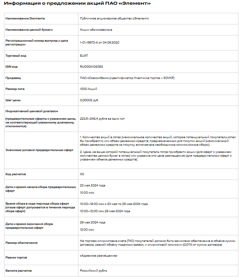 Новость: положительная. СПБ Биржа объявляет о начале сбора предварительных оферт на покупку акций ПАО «Элемент». СПБ Биржа с 23 мая 2024 года начинает сбор предварительных оферт на покупку обыкновенных акций ПАО «Элемент». Акции ПАО «Элемент» с 30 мая 2024 года включаются в Котировальный список первого уровня СПБ Биржи. Акциям присвоен тикер ELMT. Участие в предложении акций ПАО «Элемент» будет доступно институциональным инвесторам, а также физическим лицам — квалифицированным и неквалифицированным инвесторам. Принять участие в предложении акций ПАО «Элемент» инвесторы могут через инвестиционные сервисы своих брокеров до 29 мая 2024 года включительно. Расчёты по сделкам с ценными бумагами ELMT будут осуществляться на СПБ Бирже в рублях, минимальный лот — 1000 акций. Индикативный ценовой диапазон установлен эмитентом на уровне от 223,6 рубля до 248,4 рубля за лот. Ожидается, что торги акциями начнутся не позднее 30 мая 2024 года. До окончания периода сбора предварительных оферт потенциальные приобретатели могут изменить или отозвать поданные оферты. Источник: www.spbexchange.ru