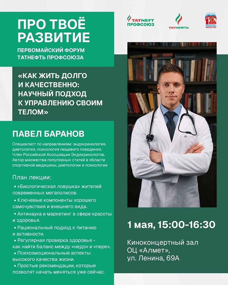 Здоровье — это главный актив. Забота о себе начинается с правильного подхода: регулярная физическая активность, качественный сон, управление стрессом и внимание к ментальному состоянию. В Татнефти к этому относятся серьёзно. В компании реализуется комплексная программа поддержки здоровья для своих сотрудников, и Первомайский форум Татнефть Профсоюза стал важным шагом на этом пути. Как сохранить ясный ум, энергию и бодрость на долгие годы? Почему мозгу нужна особая забота? Что мы на самом деле «заедаем», когда нервничаем? Какие биологические ловушки поджидают горожан? И какие методы заботы о себе действительно работают? Ответы — на форуме «Про твое развитие». Только доказанные подходы и живая лекция от профессионалов. Наши спикеры: ➥ Людмила Сабирова — бизнес-тренер, ICF-коуч, игропрактик ➥ Регина Хасанова — бизнес-тренер, дипломированный коуч, МАК-коуч, игротерапевт, фасилитатор ➥ Елена Новоселова — семейный психолог, член Российской психотерапевтической лиги ➥ Павел Баранов — член Российской ассоциации эндокринологов, автор множества популярных статей в области спортивной медицины, диетологии и психологии, специалист по направлениям «Эндокринология», «Диетология», «Психология пищевого поведения» Когда и где: ➠ 1 мая, начало в 9:00 ➠ Альметьевск, Общественный центр «Алмет» (Ленина, 69А) ➠ Вход свободный, но места ограничены (регистрация обязательна в мобильном приложении Татнефть Профсоюза) Не сможете приехать? Подключайтесь к прямому эфиру в сообществе ВКонтакте https://vk.com/tatneftprofsoyuz Приходите заряжаться энергией! [Мы в «Максе»](https://max.ru/tatneft)
