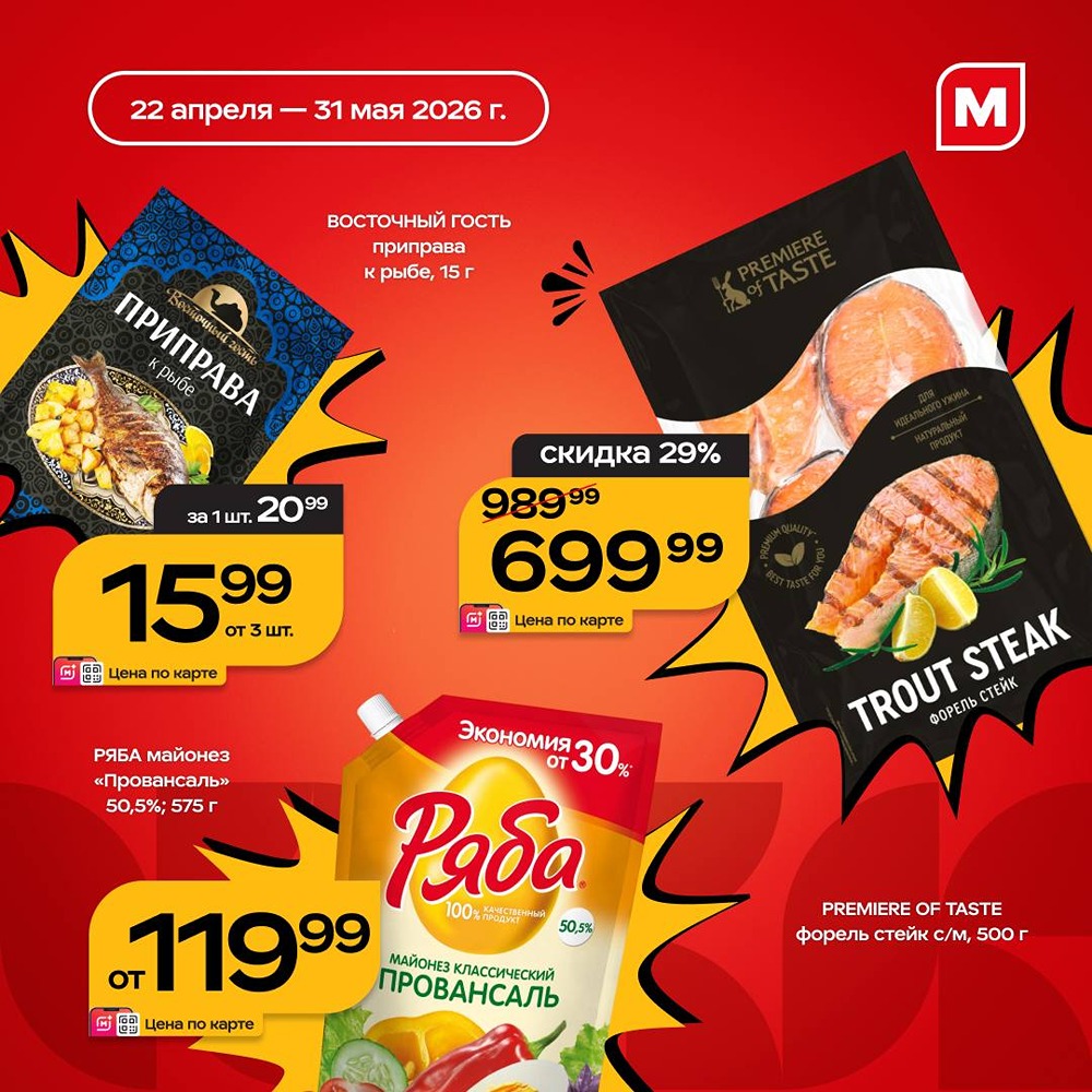 Солнце греет всё сильнее — пора доставать мангал и собирать друзей. До 31 мая покупайте в «Магните» всё необходимое для вкусного отдыха. В чек-листе собрали [продукты со скидками до 35%](https://magnit.market/ru/catalog/product/1000001535). ➥ Купаты «М. Свежесть» и стейк форели Premiere of Taste ➥ Кетчуп Heinz, майонез «Ряба» и приправа к рыбе «Восточный гость» ➥ Газированные напитки «Добрый» «Кола» и «Черноголовка» «Дюшес», сок «Сады Придонья» и светлое безалкогольное пиво «Балтика» [Подписывайтесь на Магнит в Max](https://max.ru/magnitretail)