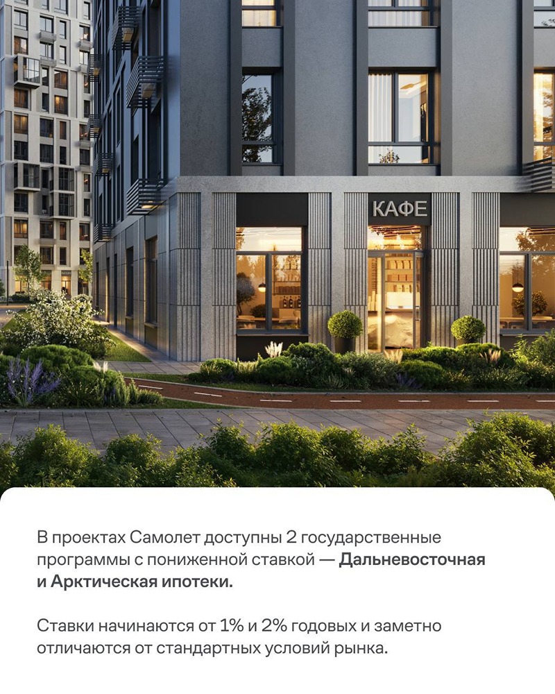 Ипотека 1% и 2% в проектах «Самолёт» Сейчас «Самолёт» предлагает сразу 2 программы с минимальными процентами. Ипотеки с процентной ставкой от 1% и 2% годовых — одни из самых выгодных на рынке: • [Дальневосточная](https://samolet.ru/vladivostok/?utm_source=telegram_channels&utm_medium=smm&utm_campaign=gk-samolet_vld-common_ipt-east-bet_vld_post_2026-04-23) (Владивосток, Корсаков, Чита) • [Арктическая](https://samolet.ru/murmansk/?utm_source=telegram_channels&utm_medium=smm&utm_campaign=gk-samolet_murm-common_ipt-arctic-bet_murm_post_2026-04-23) (Мурманск). Купить квартиру по этим программам можно, даже если вы не живете в регионе, в котором находится проект. Достаточно оформить прописку в регионе и сохранить ее на 5 лет. Эти программы дают возможность совершить покупку на условиях, которые сегодня выглядят особенно комфортно. [Постепенно меняются требования](https://samolet.ru/spb/news/ipoteka-tolko-s-beloj-zarplaty-uspejte-kupit-kvart/) банков к подтверждению дохода — больше решений опирается только на официальную зарплату. Поэтому текущие условия лучше зафиксировать заранее. Воспользуйтесь возможностью купить квартиру максимально выгодно. Выберите подходящие под программы варианты на сайте «Самолёт». Смотрите карточки, чтобы сразу найти проекты, на которые действуют Арктическая и Дальневосточные ипотеки.