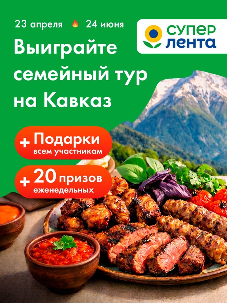 Приглашаем на Фестиваль гриля в СУПЕР ЛЕНТА! В течение двух месяцев вас ждёт настоящий пир для истинных ценителей мяса и птицы. Порадуем широким ассортиментом, выгодными акциями, новинками и оригинальными рецептами. [Погрузитесь в атмосферу восхитительного вкуса и аромата](https://lentaapp.go.link/action/detail/4882/?adj_t=1zb674to&adj_deep_link=lentochka%3A%2F%2Faction%2Fdetail%2F4882%2F&adj_fallback=https%3A%2F%2Flenta.com%2Faction%2Fdetail%2F4882%2F%3Futm_source%3Dtelegram.own%26utm_medium%3Dsocial%26utm_campaign%3Dkavkazpartners_april&adj_redirect_macos=https%3A%2F%2Flenta.com%2Faction%2Fdetail%2F4882%2F%3Futm_source%3Dtelegram.own%26utm_medium%3Dsocial%26utm_campaign%3Dkavkazpartners_april) в «Супер Ленте» — готовим с огоньком! На главном розыгрыше фестиваля СУПЕР ЛЕНТА и «Авентурамания» дарят семейную путёвку на Кавказ с трансфером, проживанием, экскурсионным сопровождением по достопримечательностям и погружением в национальную кухню. А ещё: ➥ 20 сертификатов по 2 000₽ на покупки в «Супер Ленте» каждую неделю, ➥ гарантированный приз — скидка 2 000₽ на авторские туры «Авентурамании». Только представьте: свежий воздух, вкусная национальная еда, головокружительные виды на Кавказские горы, и вы с семьёй — в этих живописных локациях! ➥ Совершайте покупки в «Супер Ленте» с доставкой и самовывозом на сумму от 1 000₽, включая любую мясную продукцию. ➥ Регистрируйтесь на сайте розыгрыша: mechta.lenta.com. [Каждый чек и покупка товаров-партнёров](https://lentaapp.go.link/action/detail/4882/?adj_t=1zb674to&adj_deep_link=lentochka%3A%2F%2Faction%2Fdetail%2F4882%2F&adj_fallback=https%3A%2F%2Flenta.com%2Faction%2Fdetail%2F4882%2F%3Futm_source%3Dtelegram.own%26utm_medium%3Dsocial%26utm_campaign%3Dkavkazpartners_april&adj_redirect_macos=https%3A%2F%2Flenta.com%2Faction%2Fdetail%2F4882%2F%3Futm_source%3Dtelegram.own%26utm_medium%3Dsocial%26utm_campaign%3Dkavkazpartners_april) приносят +1 шанс на выигрыш. [Мы в Max](max.ru/lentacom)