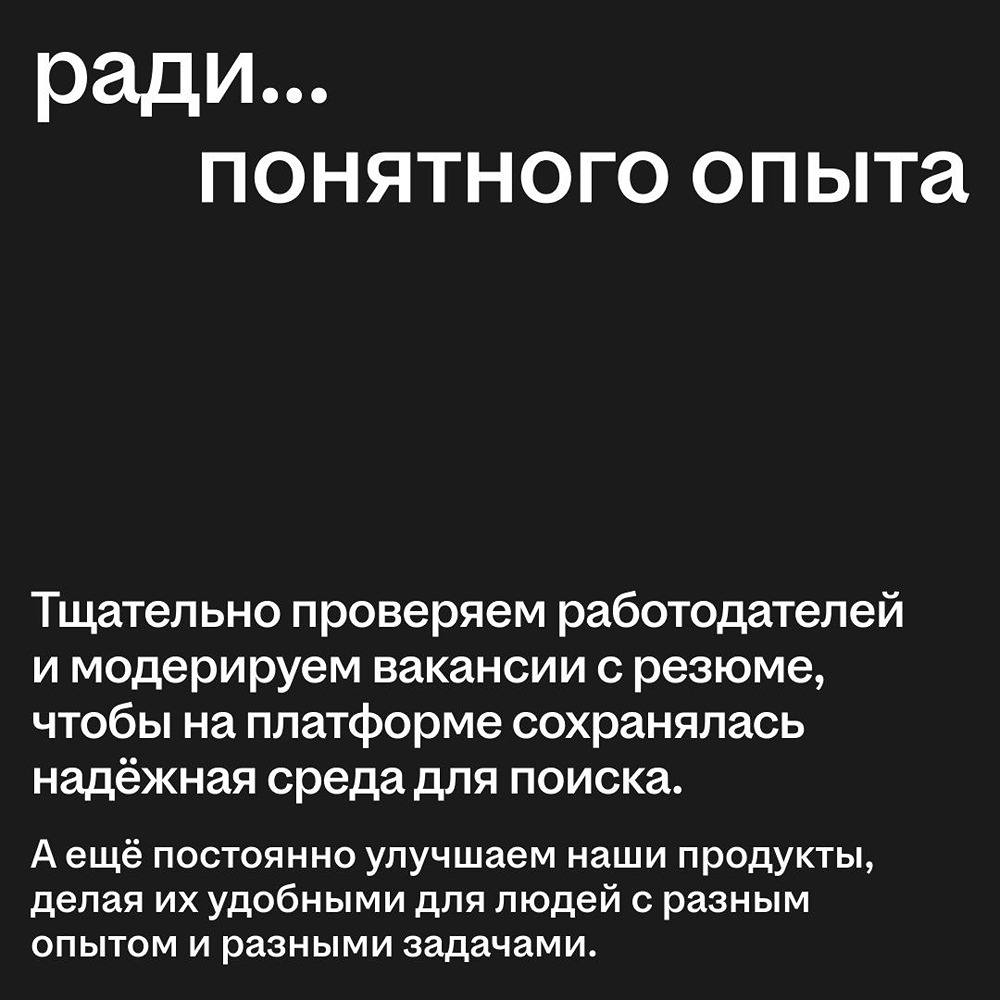 Мы развиваем наш сервис не ради галочки Нам важно, чтобы инструменты платформы помогали людям находить работу, а компаниям — своих кандидатов. Поэтому мы не стоим на месте и постоянно прислушиваемся к вам, чтобы сервис оставался удобным для всех. О том, как мы улучшаем продукты, работаем с исследованиями и помогаем рынку труда стать сильнее, рассказали в карточках.