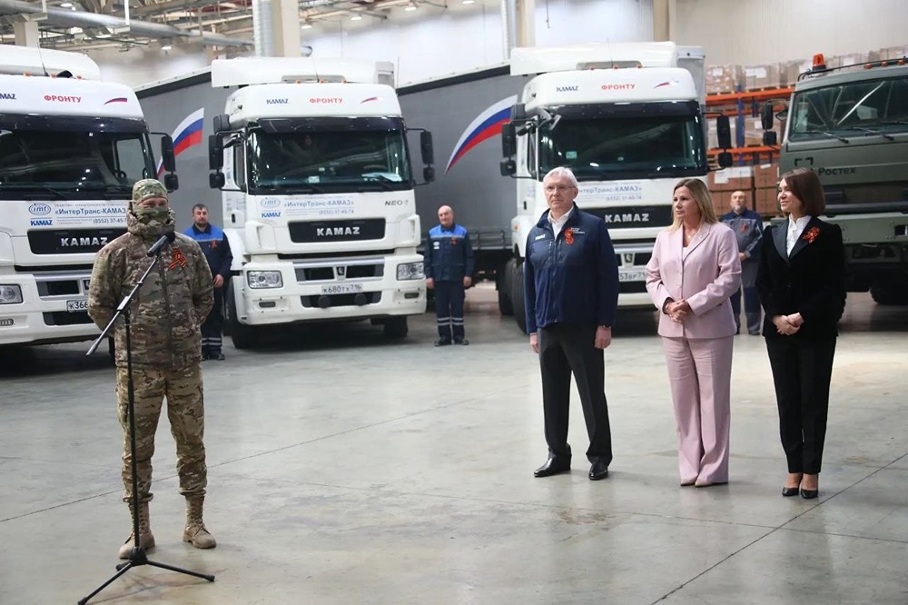 Сегодня, 24 апреля 2026, в преддверии Дня Победы в Великой Отечественной войне состоялась очередная отправка гуманитарного груза от «КАМАЗа» в зону проведения СВО. В торжественном мероприятии, состоявшемся в Набережных Челнах, приняли участие генеральный директор ПАО «КАМАЗ» Сергей Когогин, а также депутат Государственной Думы РФ Альфия Когогина, представители заводов «КАМАЗа» и городских властей. В подшефные воинские части в зону проведения СВО в составе уже 26-го по счёту конвоя отправляется более 130 тонн гуманитарного груза на общую сумму 126 млн рублей. Груз традиционно формируется непосредственно по просьбам командиров полков и самих бойцов, учтены потребности получателей. В состав очередного конвоя вошли четыре грузовых автомобиля «КАМАЗ», четыре легковых автомобиля, гусеничный тягач, квадрокоптеры, колёса и запасные части, походные бани, резиновая транспортировочная лента, спальные мешки, окопные свечи, маскировочные сети. Также бойцам направлены персональные посылки и письма от коллег и близких.