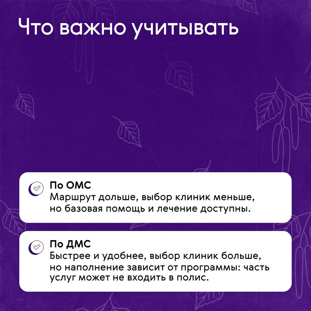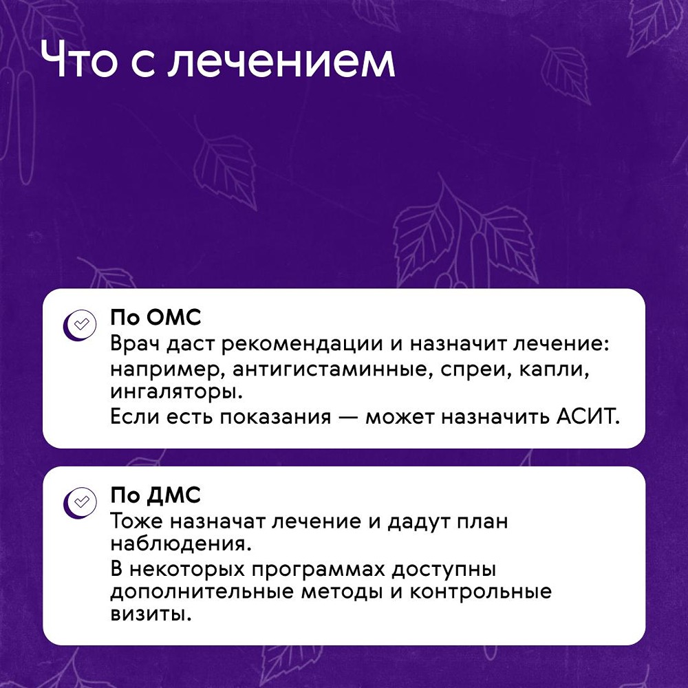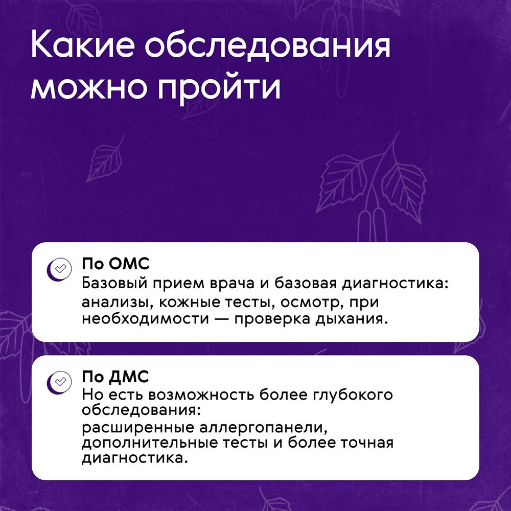 Старт сезона аллергии: что вам даст ОМС и ДМС Наверняка вы уже почувствовали начало сезона цветения, пытаясь разглядеть наш пост на экране телефона опухшими глазами сквозь слезы. Виноваты в этом первые «подснежники» в мире аллергии: ➥ Ольха ➥ Лещина (орешник) ➥ Верба / ива Именно они начинают пылить первыми, еще когда нет листьев — пыльца летит очень активно и далеко. А еще сразу попадает в носоглотку, потому что очень мелкая. В честь этого в карточках рассказали, как обратиться за помощью по полису ДМС и ОМС и что вам гарантировано в обоих случаях. [Наш канал в тг](t.me/renins_official)