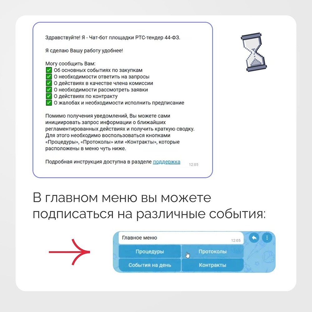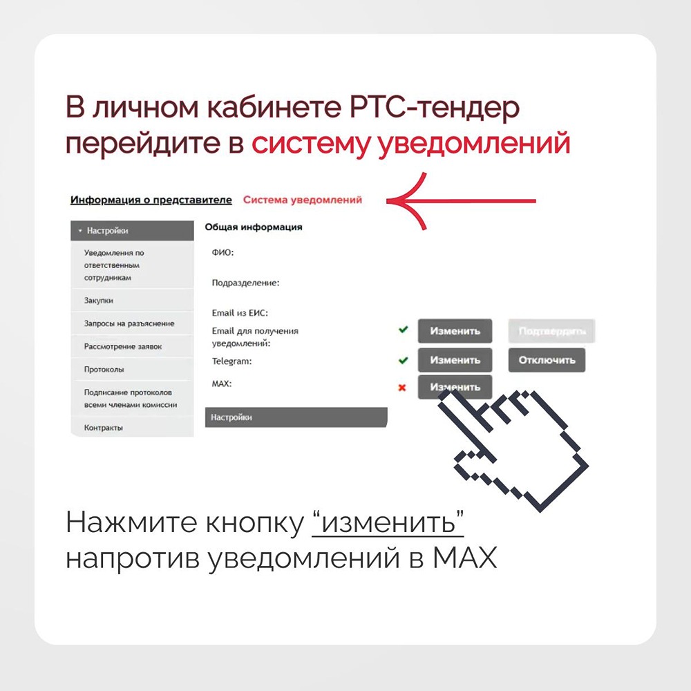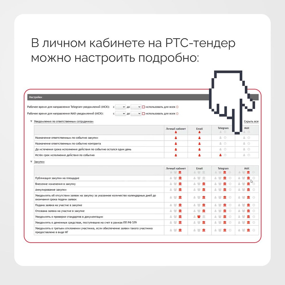Кое-что новое для тех, кто работает по 44-ФЗ (и скоро-скоро для 223-ФЗ). Мы запустили бота в МАХ для заказчиков — и, кажется, он закрывает ту самую потребность: знать, что происходит по закупкам, не залезая каждый раз в ЛК. Как это работает: подключаете бота в настройках уведомлений в личном кабинете, выбираете нужные события — и дальше они сами приходят в мессенджер. Подали заявку на вашу процедуру — пуш. Пора публиковать протокол — пуш. Поставщик прислал запрос на разъяснение — пуш. Каждое уведомление со ссылкой на нужную форму. Есть утренняя подборка — одно сообщение со всем, что истекает за ближайшие сутки. Удобно, чтобы спланировать день и не обнаруживать сюрпризы к вечеру. 🗿 Гибкие настройки: выбираете тип событий, время получения и охват — только свои закупки, весь отдел или вся организация. Руководителю — одно, специалисту — другое, каждый собирает под себя. Как подключить, показали в карточках. Это всё бесплатно, ну а как иначе) P.S. Самое время не только уведомления в МАХ настроить, но и [подписаться](https://max.ru/rtstender) на РТС-тендер. [Наш канал в МАКС](https://max.ru/rtstender) [Наш тг канал](t.me/rtstenderinfo) [Наш сайт](rts-tender.ru) [Служба поддержки](info@rts-tender.ru) [Сотрудничество](pr@rts-tender.ru)