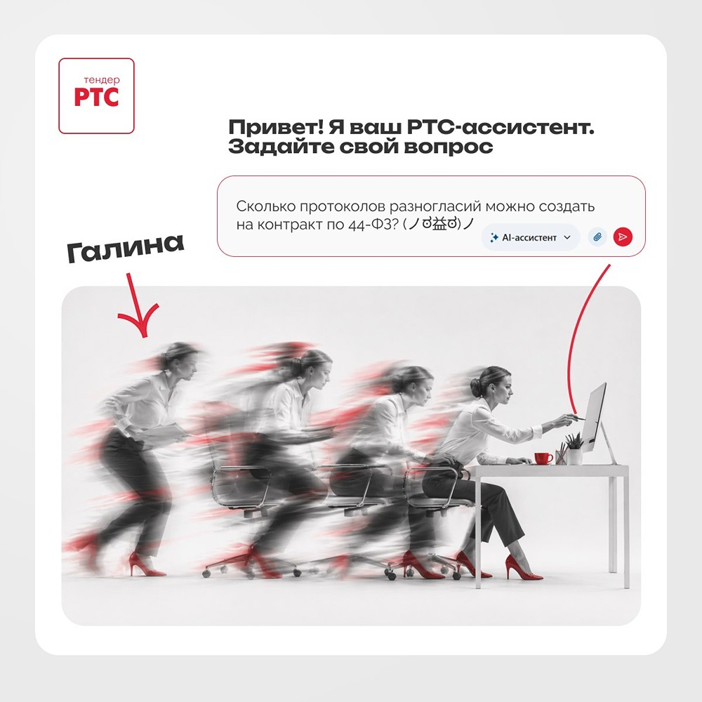 Галина хотела быстро уточнить пару моментов по протоколам разногласий. Спустя три часа и три эспрессо в её браузере уже сияли 33 вкладки: от всей нормативки до рецепта тыквенного супа (случайно как-то получилось). Коллеги в рабочем чате молчали. Зараза (ง'̀-'́)ง Галина, спокойно. В личном кабинете на РТС-тендер есть персональный ИИ-ассистент — кнопка прямо наверху интерфейса! Под капотом у РТС-ассистента уже все самые актуальные нормативные акты. И что важно: нашу ИИ-модель не нужно долго погружать в контекст, прописывать роли и умолять выдать приемлемый ответ. Всё уже настроено, осталось задать вопрос человеческим языком — как коллеге за чашечкой кофе. Вот советы по оптимизации: ➥ Одна тема — один диалог. У любой нейросети ограниченная память. Если свалить в один чат и протоколы разногласий, и авансирование, и РНП — к пятому вопросу ассистент может и подрастеряться. Ну прямо как ваш коллега-зумер. ➥ Подкидывайте контекст. «Как провести закупку питания» — сработает. «Как провести закупку питания для детского сада» — сработает заметно лучше. Если у вашей организации есть специфика — скажите про неё. Ассистент умеет её учитывать. ➥ Спорьте. «Дай короче». «Распиши подробнее». «Приведи пример для стройки». «А если заказчик — медучреждение?» «Уточни со ссылкой на статью». Всё это он понимает и переписывает ответ. Не получилось с первого раза — дёргайте, как коллегу на совещании, который мыслями уже «в отпуске». Честно про границы: РТС-Ассистент — это дополнительное мнение и быстрый доступ к нормативке, а не юрист и не итоговое решение по вашей конкретной закупке. Галлюцинации случаются у любого ИИ — у нашего реже, потому что база закрытая и проверенная (скажем, наша модель не зацепит случайную информацию из неизвестных источников). Под каждым диалогом внутри ассистента есть реакции 👍 и 👎 — ими обязательно нужно пользоваться, чтобы дообучить его. Скоро к реакциям можно будет добавлять и комментарии — чтобы мы понимали, что конкретно нужно доработать. Пока ассистент знает только 44-ФЗ. 223-ФЗ и многое другое — на подходе. [Наш канал в МАКС](https://max.ru/rtstender) [Наш тг канал](t.me/rtstenderinfo) [Наш сайт](rts-tender.ru) [Служба поддержки](info@rts-tender.ru) [Сотрудничество](pr@rts-tender.ru)