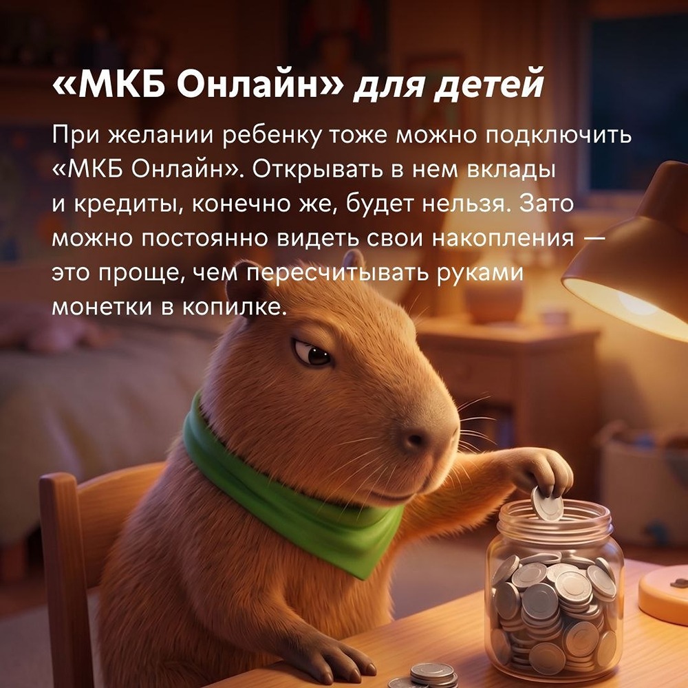 Передаем слово Кларе Она эксперт по финансам и самая умиротворенная капибара на свете. О таком спокойствии мечтает каждый родитель, особенно когда дело касается первых карманных денег. Клара рассказывает, почему с [детской картой МКБ](https://mkb.ru/personal/cards/kidscard?utm_source=tg&utm_medium=cpc&utm_campaign=smm&utm_content=28042026) волноваться не о чем. Разложила все по полочкам (и по карточкам). [МКБ в MAX](https://max.ru/mkbbank)