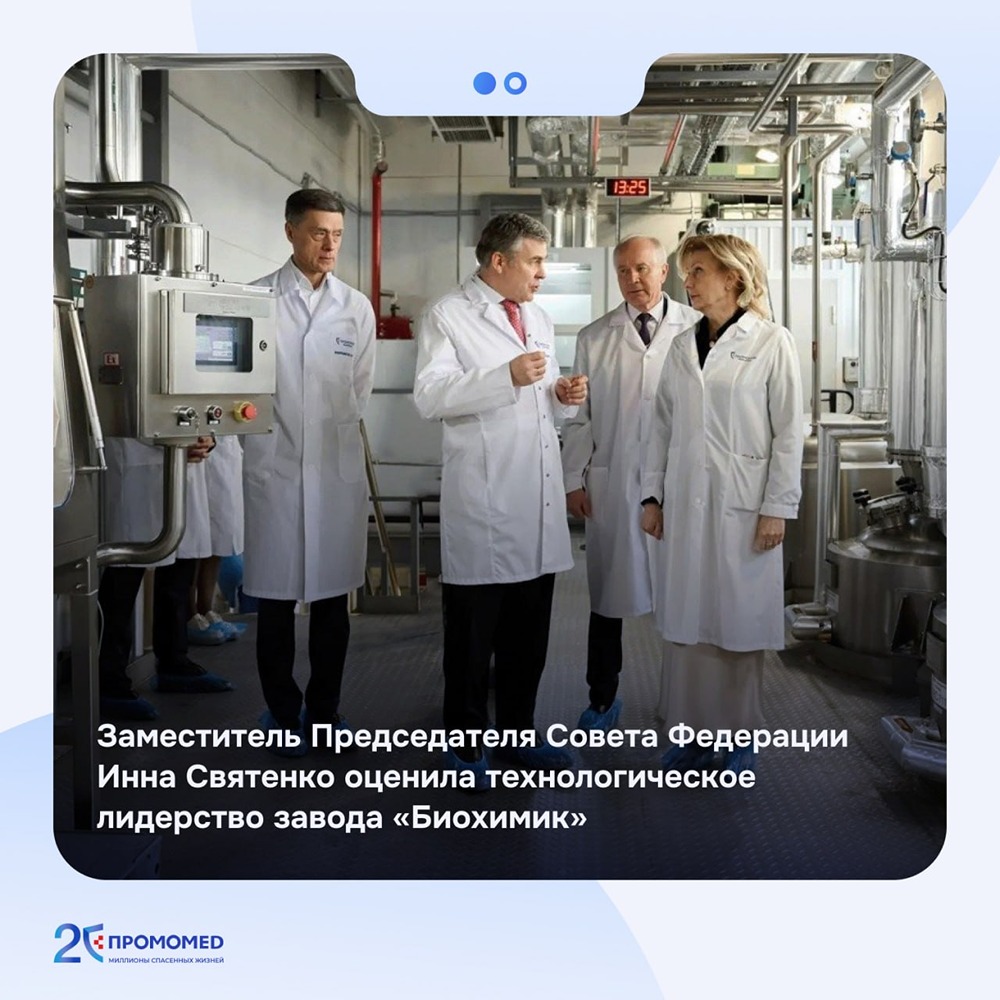 В рамках Всероссийской выездной конференции по развитию медицины здорового долголетия заместитель председателя Совета Федерации Инна Святенко посетила завод «Биохимик» группы «Промомед», где оценила технологическое лидерство предприятия. Мы показали, как работает производство активных фармацевтических субстанций. Мощность цеха АФС — до 340 тонн в год: здесь производятся субстанции для востребованных системой здравоохранения лекарственных препаратов. Инна Святенко также смогла ознакомиться с высокотехнологичным оснащением завода «Биохимик», организацией производства и оценить систему контроля качества. Заместитель председателя Совета Федерации отметила значимость наличия в стране собственных компетенций и технологических возможностей для обеспечения производства лекарств по полному циклу. Это позволяет снизить зависимость отечественного рынка от внешних вызовов и гарантирует бесперебойную доступность терапии для граждан. [Фарма — это любовь](https://t.me/promomed_rus) [Мы в МАКС](https://max.ru/promomed_rus) [Мы в VK](https://vk.com/promo_med)
