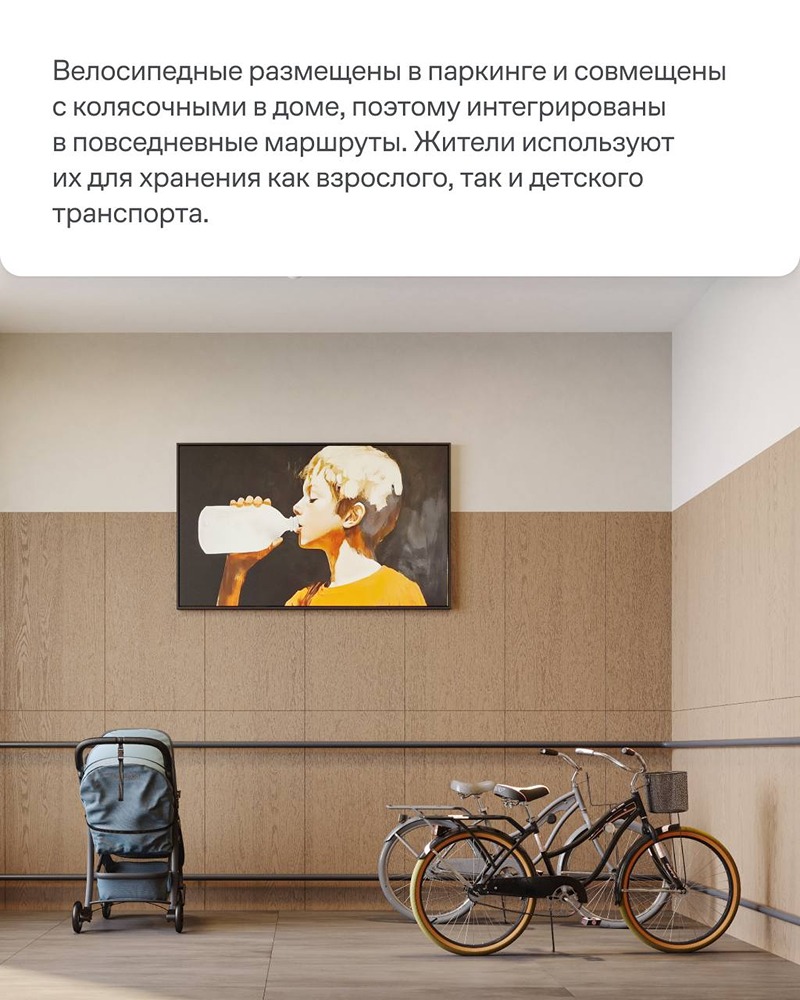 Велосипеды интегрированы в повседневность, а их хранение — в жилую среду Для многих велосипеды — часть ежедневной городской жизни, которая ускоряет повседневные маршруты и нужна для приятного активного отдыха. Хранение велосипедов должно продолжать эту логику: быть простым, удобным и не замедлять привычный ритм движения. В проектах «Самолёт» велосипедные предусмотрены в совмещении с колясочными и как функциональные зоны на территории паркинга. Они учитывают разные сценарии использования и типы инвентаря: от детских до взрослых велосипедов. Велосипедные спроектированы с учетом реального поведения жителей. Предусмотрены разные сценарии использования: от типов велосипедов до частоты поездок и способов хранения в течение года. Рассказываем, как устроены такие пространства в проектах «Самолёт». [На слайдах собраны решения, которые делают хранение велосипедов удобным каждый день — изучайте их и листайте карточки. Выбрать проект с продуманной средой для повседневной жизни можно на сайте «Самолёт»](https://samolet.ru/?utm_source=telegram_channels&utm_medium=smm&utm_campaign=gk-samolet_samoletgroup_flat-none_rf_post_2026-04-26). [Официальный канал Группы Самолет](https://t.me/gk_samoletru)