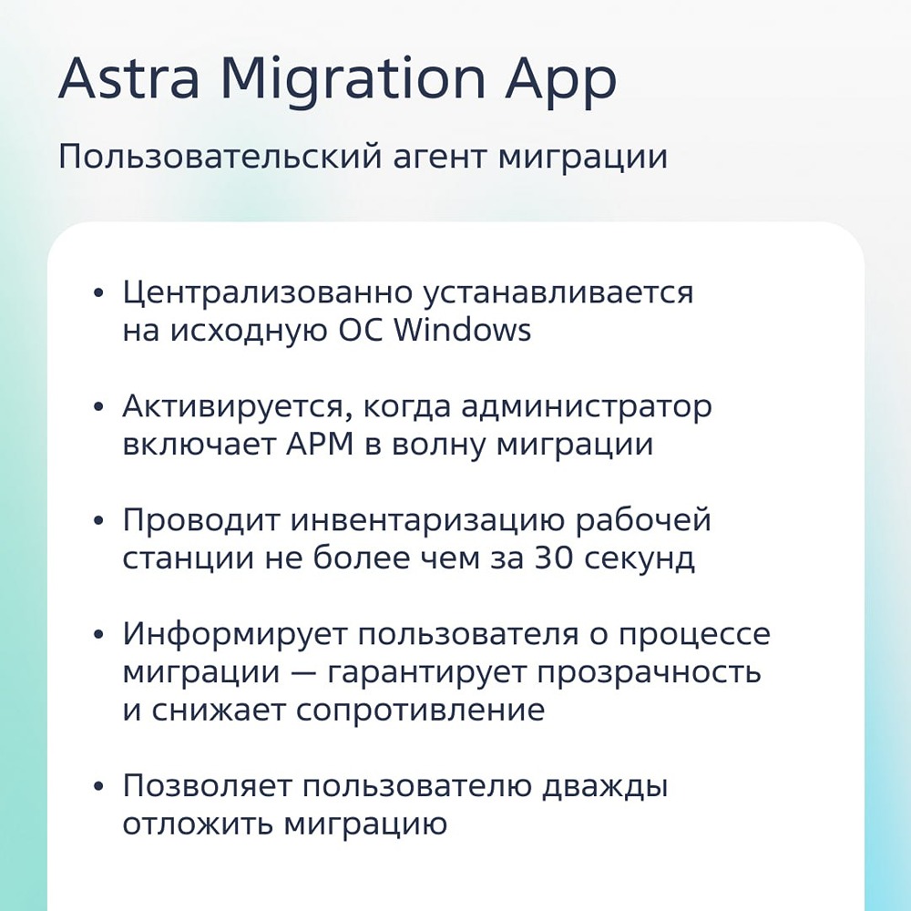 Недавно «Группа Астра» представила Astra Migration — инструмент для централизованного и быстрого перевода рабочих станций с Windows на Astra Linux. Администраторы управляют волнами и сценариями миграции в единой панели. А пользователи точно знают, когда установится новая ОС (потому что сами выбрали дату), и спокойно продолжают работать. Подготовили для вас серию карточек с ключевой информацией о продукте — смотрите, делитесь с коллегами, чтобы и ваша миграция прошла без кнопки «Боль». Оставить заявку на демо [можно на сайте](https://astralinux.ru/os/migration/?utm_medium=astragroup&utm_source=telegram&utm_campaign=astra_migration&utm_content=release) [Мы в MAX](https://max.ru/gruppa_astra) [Группа в VK](https://vk.com/gruppa_astra) [Канал в ТГ](t.me/astragroup) [Наш сайт](https://astra.ru/?utm_medium=post&utm_source=telegram&utm_campaign=astra_group&utm_content=cta)