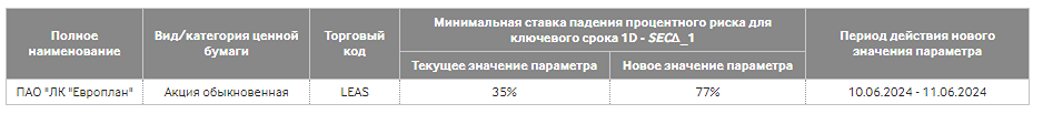 Новость: негативная. Об изменении риск-параметров по акциям. В связи с корпоративными событиями будут изменены следующие риск-параметры (см.вложение). Источник: www.moex.com