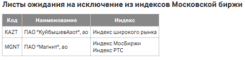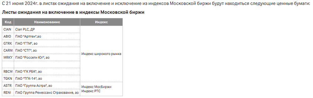 Новость: нейтральная. Новые базы расчета индексов Московской Биржи. Московская Биржа по рекомендации Индексного комитета сформировала базы расчета индексов акций, которые будут действовать с 21 июня 2024 года, а также установила значения коэффициентов free-float и дополнительных ограничительных весовых коэффициентов для ценных бумаг ряда эмитентов. В базу расчета Индекса МосБиржи и Индекса РТС войдут обыкновенные акции ПАО "ЛК "Европлан". В базу расчета Индекса голубых фишек будут включены обыкновенные акции МКПАО "ТКС Холдинг", при этом обыкновенные акции МКПАО "Объединенная компания "РУСАЛ" покинут индекс. База расчета Индекса средней и малой капитализации изменится за счет включения обыкновенных акций ПАО "Группа Астра", обыкновенных акций ПАО "ЛК "Европлан" и обыкновенных акций ПАО "МТС-Банк", и исключения депозитарных расписок иностранного эмитента на акции Фикс Прайс Груп Лтд. В базу расчета Индекса акций широкого рынка войдут обыкновенные акции ПАО "ЛК "Европлан", обыкновенные акции ПАО "МТС-Банк", обыкновенные акции ПАО "Софтлайн", обыкновенные акции ПАО "Россети Северо-Запад", обыкновенные акции ПАО "Диасофт" и обыкновенные акции ПАО МФК "Займер". Депозитарные расписки иностранного эмитента на акции Фикс Прайс Груп Лтд, обыкновенные акции ПАО "РКК "Энергия" им. С.П. Королёва", обыкновенные акции ПАО "СПБ Биржа", обыкновенные акции ПАО "Нижнекамскнефтехим" и обыкновенные акции ПАО "ЧМК" будут исключены из индекса. Отраслевой Индекс информационных технологий изменится за счет включения обыкновенных акций ПАО "Софтлайн" и обыкновенных акций ПАО "Диасофт". Депозитарные расписки иностранного эмитента на акции Фикс Прайс Груп Лтд покинут отраслевой Индекс потребительского сектора. Обыкновенные акции ПАО "Нижнекамскнефтехим" исключаются из отраслевого Индекса химии и нефтехимии. В базу расчета Индекса электроэнергетики войдут обыкновенные акции ПАО "Россети Северо-Запад". В отраслевой Индекс финансов войдут обыкновенные акции ПАО "ЛК "Европлан", обыкновенные акции ПАО "МТС-Банк" и обыкновенные акции ПАО МФК "Займер", при этом обыкновенные акции ПАО "СПБ Биржа" покинут индекс. В лист ожидания на включение в базу расчета Индекса МосБиржи и Индекса РТС войдут обыкновенные акции ПАО "Группа Астра" и обыкновенные акции ПАО "Группа Ренессанс Страхование". Обыкновенные акции ПАО "Магнит" войдут в лист ожидания на исключение из базы расчета Индекса МосБиржи и Индекса РТС. Источник: www.moex.com