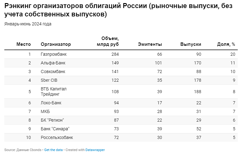Новость: положительная. ГПБ, «Альфа» и Совкомбанк стали лидерами по объему размещений бондов в I полугодии. Прошлогодний лидер БК «Регион» в этом году занял лишь восьмое место, а Sber CIB переместился на четвертое место Первое полугодие 2024 года стало успешным для организаторов долговых размещений: инвестбанки провели более 500 рыночных размещений (без учета собственных) почти на 1,4 трлн рублей. На первое место по объему рыночных выпусков (без учета собственных) вышел Газпромбанк, который провел 90 размещений на 284 млрд рублей. Годом ранее банк занимал только третью строчку, пишет «Коммерсантъ» со ссылкой на данные Cbonds. Второе место занял Альфа-банк (инвестбанк провел размещений на 149 млрд рублей), ранее он занимал пятое место в рэнкинге. На третьем месте по итогам первого полугодия этого года оказался Совкомбанк, который провел размещения на 141 млрд рублей. Ранее он занимал седьмое место. Прошлогодний лидер БК «Регион» в этом году занял лишь восьмое место (29 размещений на 87 млрд рублей), а Sber CIB с показателем 122 млрд рублей переместился со второго на четвертое место. Пятерку замыкает «ВТБ Капитал Трейдинг», который организовал размещения на 108,3 млрд рублей. Как отмечает начальник управления рынков капитала Сбербанка Эдуард Джабаров, ряд банков обеспечивает себе высокое место в рейтинге за счет сугубо внутригрупповых сделок. Также участники рынка отмечают новую тенденцию: эмитенты для выпуска своих облигаций привлекают не одного организатора из крупных банков, а несколько из более мелких компаний. Актуальность привлечения синдикатов выросла на фоне ужесточения риторики Банка России, что привело к росту ставок на долговом рынке, поясняет руководитель департамента рынков капитала Совкомбанка Роберт Смакаев. К тому же сократилась и доля крупных сделок, то есть с объемом от 30 млрд рублей. «Если в первом квартале текущего года на семь крупных сделок пришлось более 58% от общего объема размещения, то во втором квартале на восемь сделок пришлось только 44%. При этом средний размер крупной сделки снизился с 98 млрд до 59 млрд рублей», - отмечает главный аналитик долговых рынков БК «Регион» Александр Ермак. Кроме того, к середине года увеличилось число размещений облигаций с плавающим купоном. Участники рынка не исключают, что во втором полугодии, которое традиционно считается более активным с точки зрения первичных размещений, расстановка сил может измениться: в конце года происходят крупные погашения, кроме того, эмитенты готовят финансирование для будущего года. Причем, как отмечают эксперты, даже возможное повышение ключевой ставки не затормозит размещения. Источник: www.frankmedia.ru