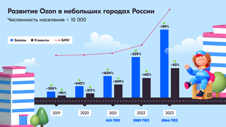 Новость: нейтральная. Жители малых городов стали в 4 раза чаще делать покупки на Ozon. Ozon проанализировал, как в 2023 году росло число предпринимателей и популярность онлайн-покупок среди жителей городов с населением до 10 тысяч человек. - Продажи в малых городах росли в два раза быстрее, чем в целом на маркетплейсе, за счет опережающего роста числа покупателей; - Заказы из таких населенных пунктов стали делать в 2023 году в четыре раза чаще; - Количество продавцов из них в 2023 году выросло на 85%; - Рост популярности маркетплейса объясняется трехкратным увеличением числа ПВЗ в малых городах за год. В 2023 году оборот Ozon в городах с населением менее 10 тысяч человек вырос в 4,3 раза по сравнению с 2022 годом. В среднем годовой оборот Ozon по стране в прошлом году вырос в 2,1 раза. Число заказов в городах до 10 тысяч жителей год к году выросло почти в 4 раза в 2023 году. Опережающий рост продаж связан с активным выходом на площадку новых клиентов из городов до 10 тысяч. База активных покупателей из малых городов росла в 10 раз быстрее, чем общее число покупателей на площадке: в 2023 году их стало в 3,2 раза больше, в то время как база клиентов Ozon в целом прибавила 31%. Однако потенциал роста онлайн-коммерции остается как в крупных городах, так и в небольших. Так, в мегаполисах, где онлайн-покупки у многих вошли в привычку, заказы на Ozon в 2023 году выросли в 2,4 раза. Стимул развития — рост числа партнерских ПВЗ маркетплейса. Интерес к покупкам на маркетплейсе резко вырос за счет кратного увеличения числа точек выдачи заказов в небольших городах. Партнеры-владельцы ПВЗ из городов с населением до 10 тысяч жителей до конца 2023 года открыли почти 9 тысяч пунктов Ozon. Теперь точки выдачи в малых населенных пунктах охватили 81 регион России, и таких ПВЗ стало в 3 раза больше по сравнению с 2022 годом. Пункты выдачи Ozon играют важную роль в жизни малых населенных пунктов, обеспечивая доступ к широкому ассортименту товаров и создавая дополнительные рабочие места. По подсчетам Ozon, открытие пункта выдачи создает в среднем 2,5 рабочих места. «Одна из главных целей Ozon - предоставление равного доступа к разнообразию товаров для жителей как мегаполисов, так и малых городов России. Для достижения этой цели компания активно расширяет свою логистическую инфраструктуру, охватывая удобной доставкой все больше населенных пунктов. Таким образом, Ozon поддерживает жителей малых городов, где появление пунктов выдачи стимулирует развитие бизнеса и повышает качество жизни для местных жителей», — отметил директор маркетплейса Ozon по логистике Александр Гейль. Больше возможностей для предпринимателей. С развитием логистики и расширением сети ПВЗ выход на маркетплейсы стал доступнее для продавцов из небольших населенных пунктов: в 2023 году только индивидуальных предпринимателей стало на 85% больше, чем в 2022 году. Обороты таких продавцов из городов до 10 тысяч жителей в 2023 году увеличились в 2,4 раза год к году, а продаваемый ими ассортимент товаров вырос на 68%. На сегодняшний день в городах до 10 тысяч жителей открыто уже более 13 тысяч пунктов выдачи Ozon, ими владеют более 7,5 тысяч предпринимателей, для которых открытие пункта выдачи маркетплейса - уникальная возможность вести бизнес в сегменте онлайн-коммерции и оставаться в любимом городе. Открытие новых точек также стимулирует выход новых продавцов на маркетпле