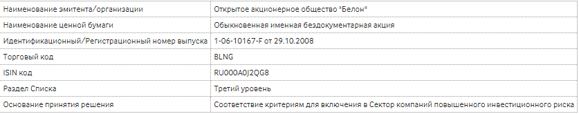 Новость: негативная. О включении ценных бумаг в Сектор компаний повышенного инвестиционного риска и об исключении ценных бумаг из Сектора Роста. В соответствии с Правилами листинга ПАО Московская Биржа Председателем Правления 26.07.2024 приняты следующие решения: Включить с 29.07.2024 в Cектор компаний повышенного инвестиционного риска следующие ценные бумаги эмитента/организации: Открытое акционерное общество "Белон". Источник: www.moex.com