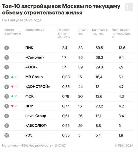 Назван топ-10 застройщиков Москвы по объемам строительства жилья. Первую тройку рейтинга застройщиков по объему возводимого в столице жилья в июле 2024 года составили ГК «ПИК», ГК «Самолет» и «А101». Группа компаний «ПИК» сохранила первое место среди девелоперов по текущему объему строительства жилья в Москве. Это следует из рейтинга «РБК-Недвижимости», составленного на основе данных Единой информационной системы жилищного строительства (ЕИСЖС). На начало августа 2024 года ГК «ПИК» строит в столице 83 жилых дома (59,5 тыс. квартир) общей площадью 2,4 млн кв. м. Проекты лидера занимают 13,6% в общем объеме возводимых новостроек в Москве. На втором месте по объему проектов в стадии строительства ГК «Самолет», которая реализует 1,7 млн кв. м (86 домов, 38,3 тыс. квартир) и занимает 9,4% на столичном рынке новостроек. Третье место у ГК «А101» (1,4 млн кв. м, 39 домов, 29,8 тыс. квартир), ее доля составляет 7,9%. На четвертом месте компания MR Group с долей 5,1%. Девелопер строит 931 тыс. кв. м в 15 домах на 16,4 тыс. квартир. Замыкает первую пятерку рейтинга компания «Донстрой», возводящая 854 тыс. кв. м (44 дома, 12 тыс. квартир) и занимающая 4,7% в общем объеме жилищного строительства в столице. По сравнению с предыдущим месяцем в десятке лидеров произошло два изменения. Компания «Донстрой» уступила четвертое место и опустилась на пятую позицию, а MR Group с пятого места поднялась на четвертое. Группа компаний ЛСР с шестой позиции опустилась на седьмую, а ФСК поднялась с седьмого места на шестое. Совокупный портфель текущего строительства столичных девелоперов на начало августа составил 18,08 млн кв. м. Это на 0,5% меньше июльского показателя (18,18 млн кв. м). Десятка крупнейших застройщиков возводит 10,47 млн кв. м, в совокупности на них приходится 57,94% в общем портфеле строящихся жилых проектов в Москве. В июне 2024 года, по данным компании «Бест-Новострой», средняя цена 1 кв. м на рынке новостроек Старой Москвы была зафиксирована на отметке 543,4 тыс. руб. Это на 2% больше майского показателя. Автор: Георгий Трушин. Источник: www.realty.rbc.ru