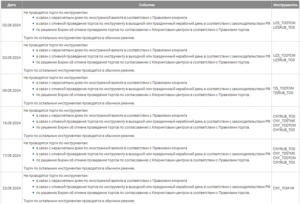 Новость: нейтральная. График проведения торгов валютой на Московской бирже 1 - 30 сентября 2024 года. Источник: www.moex.com