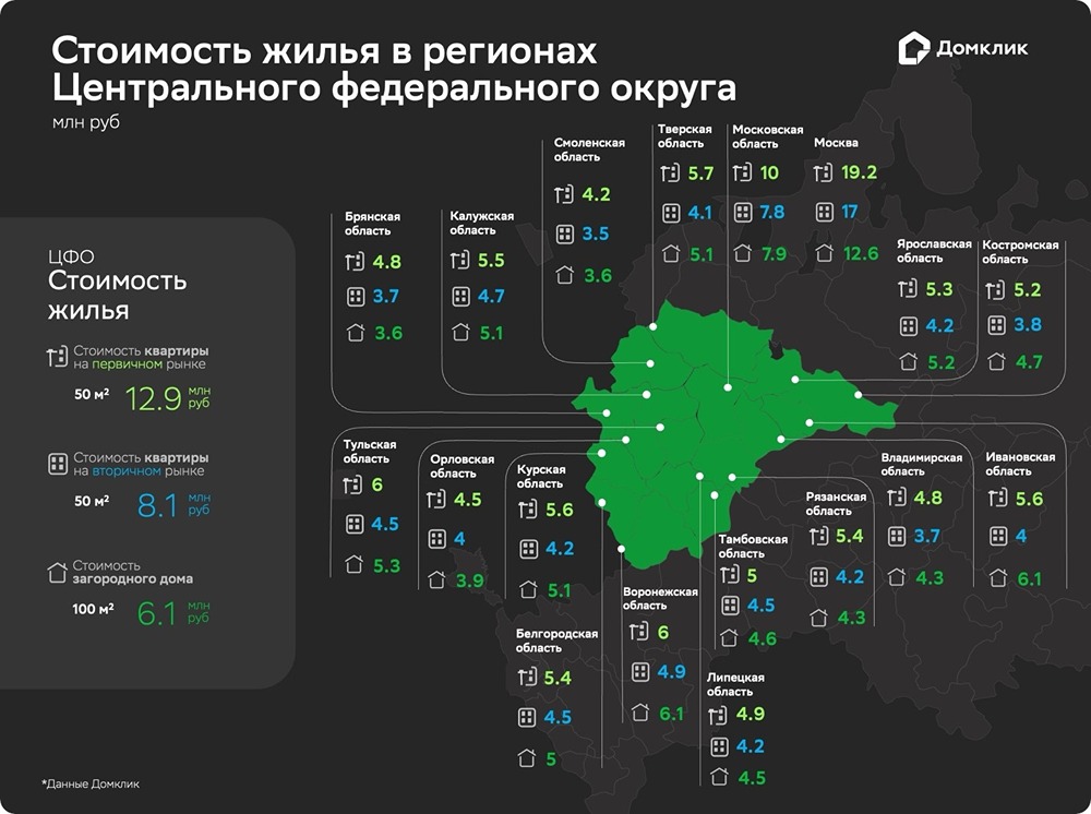 Новость: нейтральная. Анализ Домклик стоимости жилья в Центральном федеральном округе (ЦФО) на конец августа 2024 года показывает следующие данные. Средняя стоимость первичного жилья (новостройки, 50 кв. м.) колеблется от 4 до 6 млн рублей. Самые дешёвые варианты находятся в Смоленской области (4,2 млн рублей), Орловской области (4,5 млн рублей), Владимирской и Брянской областях (по 4,8 млн рублей). Самые высокие цены зафиксированы в Тульской и Воронежской областях (по 6 млн рублей), а также в Тверской области (5,7 млн рублей). Вторичные квартиры (50 кв. м.) стоят от 4 до 5 млн рублей. Наиболее доступные лоты можно найти в Смоленской области (3,5 млн рублей), Брянской и Владимирской областях (по 3,7 млн рублей). Самые дорогие варианты расположены в Воронежской области (4,9 млн рублей), Калужской области (4,7 млн рублей), Белгородской, Тамбовской и Тульской областях (по 4,5 млн рублей). Цены на загородные дома (100 кв. м.) варьируются от 4 до 6 млн рублей. Наименее дорогие лоты в Брянской и Смоленской областях (по 3,6 млн рублей), а также в Орловской области (3,9 млн рублей). Наиболее высокие цены зафиксированы в Воронежской (6,1 млн рублей), Ивановской (6,1 млн рублей) и Тульской областях (5,3 млн рублей). В Москве стоимость стандартных первичных квартир (50 кв. м.) составляет 19,2 млн рублей, вторичных — 17 млн рублей, а частных домов (100 кв. м.) — 12,6 млн рублей. В Московской области квартиры в новостройках стоят 10 млн рублей, на вторичном рынке — 7,8 млн рублей, частные дома — 7,9 млн рублей. Эти данные демонстрируют значительное различие в ценах на недвижимость как в ЦФО, так и в столичных регионах. Источник: www.sberbank.ru