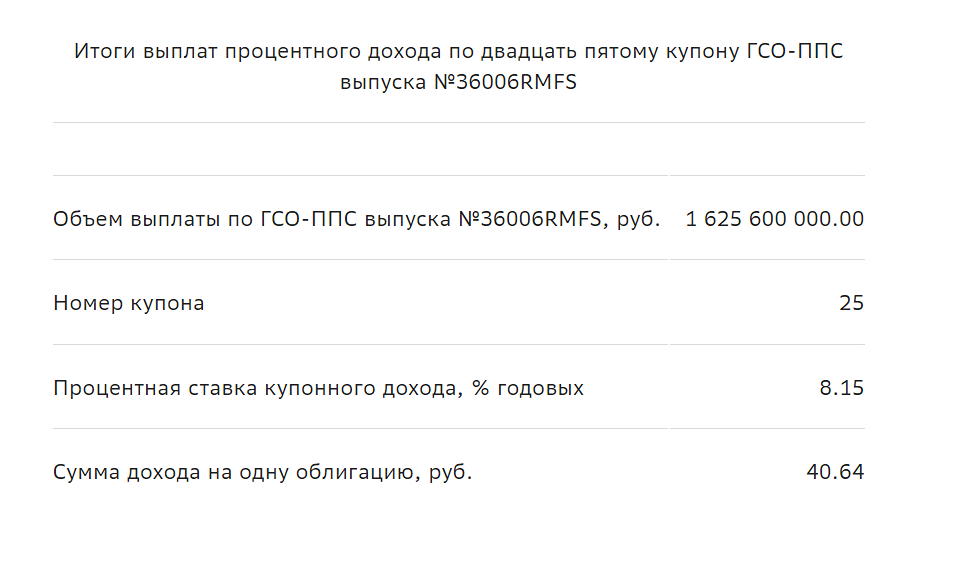 Подводя итоги, можно сказать, что процентный доход по ГСО выпуска №36006RMFS был выплачен в полном объёме.