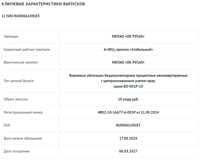 Новость: положительная. АКРА присвоило выпускам облигаций МКПАО «ОК РУСАЛ» (RU000A109JZ3, RU000A109JY6) кредитный рейтинг А+(RU). Обоснование кредитного рейтинга. Эмиссии являются старшим необеспеченным долгом МКПАО «ОК РУСАЛ» (далее — «РУСАЛ», Холдинг, Компания). По причине отсутствия структурной и контрактной субординации выпусков АКРА оценивает эти облигации как равные по очередности исполнения другим существующим и будущим необеспеченным и несубординированным обязательствам Компании. В соответствии с методологией АКРА, для определения рейтинга эмиссий Агентство использовало детальный подход. Согласно расчетам АКРА, уровень возмещения по старшему необеспеченному долгу относится к I категории, в связи с чем кредитный рейтинг эмиссий приравнивается к кредитному рейтингу Компании — A+(RU). Кредитный рейтинг Холдинга определяется с учетом его сильной рыночной позиции как глобального производителя алюминия и сильной оценки бизнес-профиля, которая, в свою очередь, связана с низкой себестоимостью производства алюминия и обеспеченностью ресурсной базой. При этом оценка продуктовой диверсификации находится на уровне ниже среднего, так как «РУСАЛ» специализируется исключительно на производстве алюминия и сплавов на его основе. Поддержку уровню кредитного рейтинга оказывают очень сильная оценка географической диверсификации продаж и высокий уровень корпоративного управления, а также очень высокая оценка субфактора «Концентрация на одном месторождении». Сдерживающим фактором для кредитного рейтинга Холдинга является высокий показатель долговой нагрузки. Регуляторное раскрытие. Кредитный рейтинг был присвоен по национальной шкале для Российской Федерации на основе Методологии присвоения кредитных рейтингов финансовым инструментам по национальной шкале для Российской Федерации, а также Основных понятий, используемых Аналитическим Кредитным Рейтинговым Агентством в рейтинговой деятельности. Кредитный рейтинг выпускам облигаций МКПАО «ОК РУСАЛ» серий БО-001Р-10 (RU000A109JZ3) и БО-001Р-11 (RU000A109JY6) был присвоен впервые. Пересмотр кредитного рейтинга ожидается в течение одного года с даты опубликования настоящего пресс-релиза. Кредитный рейтинг был присвоен на основании данных, предоставленных МКПАО «ОК РУСАЛ», информации из открытых источников, а также баз данных АКРА. Кредитный рейтинг является запрошенным, МКПАО «ОК РУСАЛ» принимало участие в процессе присвоения кредитного рейтинга. При присвоении кредитного рейтинга использовалась информация, качество и достоверность которой, по мнению АКРА, являются надлежащими и достаточными для применения методологий. АКРА оказывало МКПАО «ОК РУСАЛ» дополнительные услуги. Конфликты интересов в рамках процесса присвоения кредитного рейтинга выявлены не были. Источник: www.acra-ratings.ru