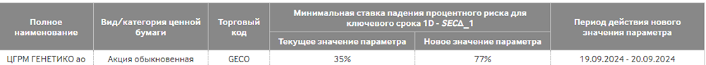 Новость: негативная. Об изменении риск-параметров по акциям. В связи с корпоративными событиями будут изменены следующие риск-параметры. Источник: www.moex.com