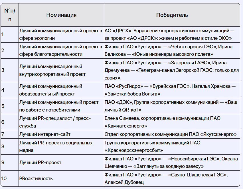 Новость: нейтральная. РУСГИДРО Наградило Лучших PR-Специалистов 2024 Года. 19 сентября 2024 года РусГидро подвело итоги VI ежегодного корпоративного конкурса «Лучший коммуникационный проект». Конкурс собрал PR-специалистов из филиалов и подконтрольных обществ Группы РусГидро. Конкурсная комиссия оценивала 129 проектов, представленных более чем 40 специалистами, и определила победителей в 10 номинациях. Источник: www.rushydro.ru