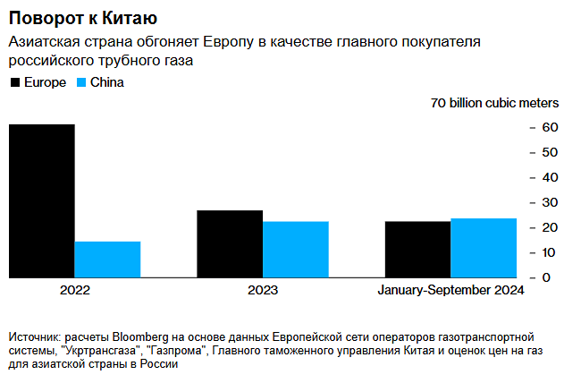 Китай обгоняет Европу как основной рынок для российского трубопроводного газа. Китай на пути к тому, чтобы стать крупнейшим рынком для трубопроводного газа из России в 2024 году, обогнав Европу, из-за ограничений на поставки топлива в регион. За девять месяцев 2024 года ПАО «Газпром» экспортировало в Китай 23,7 миллиарда кубометров природного газа, что на 40% больше по сравнению с аналогичным периодом 2023 года. В это же время объем поставок в Европу составил 22,5 миллиарда кубометров, согласно оценкам на основе данных таможни и потоков через Украину и "Турецкий поток". Увеличение поставок в Китай. Китай становится главным покупателем российского трубопроводного газа благодаря наращиванию объемов поставок по газопроводу «Сила Сибири», который был запущен в конце 2019 года с проектной мощностью 38 миллиардов кубометров в год. В прошлом месяце «Газпром» достиг соглашения с Китайской национальной нефтяной корпорацией о дополнительных поставках, которые позволят увеличить объемы до максимального контрактного уровня. По прогнозам Международного энергетического агентства, потребление газа в Китае вырастет на 8% в этом году, что связано с ростом промышленного производства и потребления в энергетическом секторе и сфере услуг. Хотя «Газпром» планирует увеличить поставки в Китай на 10 миллиардов кубометров по дальневосточному маршруту к 2027 году, это все равно лишь малая часть объемов, которые компания продавала в Европу в 2022 году. Ситуация в Европе. Европейский рынок по-прежнему важен для «Газпрома». Крупные страны, такие как Венгрия, Австрия и Словакия, остаются зависимыми от российского газа. Поставки в Европу увеличились на 16% за первые девять месяцев 2024 года по сравнению с прошлым годом. Тем не менее, с истечением пятилетнего транзитного договора с Украиной в декабре 2024 года и отсутствием намерений Киева его продлевать, половина газовых потоков в Европу может оказаться под угрозой. Европейские чиновники ищут альтернативы для сохранения транзитных потоков, и Азербайджан может стать одним из возможных решений. Однако заключение такой сделки пока не близко, так как до окончания текущего контракта остается менее трех месяцев. Источник: www.bloomberg.com