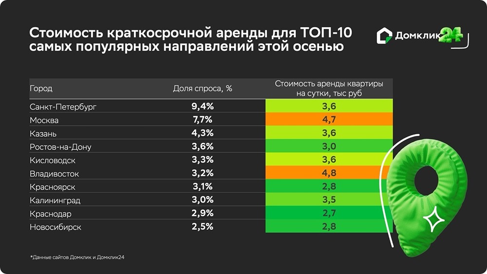 Эксперты Домклик оценили доходы от посуточной аренды жилья. Аналитический центр Домклик Сбербанка провел исследование рынка краткосрочной аренды и представил данные о стоимости посуточной аренды в популярных городах России этой осенью, основываясь на статистике сервиса Домклик24. В сентябре 2024 года стоимость аренды составила 3,6 тыс. рублей в сутки в Санкт-Петербурге, 4,7 тыс. рублей в Москве и 3,6 тыс. рублей в Казани. В Ростове-на-Дону аренда стоит 3 тыс. рублей, а в Кисловодске — 3,6 тыс. рублей. Максимальная стоимость наблюдается во Владивостоке — 4,8 тыс. рублей, а минимальная — в Краснодаре (2,7 тыс. рублей), Новосибирске и Красноярске (по 2,8 тыс. рублей). Средняя длительность проживания составляет 2-4 ночи, при этом наибольшая продолжительность наблюдается в Калининграде, Кисловодске и Санкт-Петербурге — около 4 дней, а наименьшая — в Ростове-на-Дону и Новосибирске — до 2 ночей. В Казани и Москве туристы останавливаются на 3 дня. Алексей Лейпи, директор дивизиона "Домклик", отметил, что краткосрочная аренда более доходна, чем долгосрочная. При еженедельной сдаче квартиры на 3 дня месяц может приносить около 42 тыс. рублей, в то время как медианная ставка долгосрочной аренды составляет около 35 тыс. рублей. В крупнейших регионах-лидерах (Санкт-Петербург, Москва и Казань) статистика также показывает преимущества посуточной аренды. Источник: www.sberbank.ru