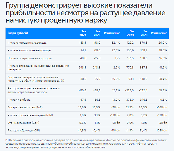 Группа ВТБ объявляет финансовые результаты по МСФО за 9 месяцев 2024 года. Банк ВТБ, головная компания группы ВТБ («Группа»), публикует обобщенную промежуточную консолидированную финансовую отчетность, подготовленную в соответствии с международными стандартами отчетности (МСФО), с заключением по результатам обзорной проверки промежуточной финансовой информации за девять месяцев, закончившихся 30 сентября 2024 года. Дмитрий Пьянов, Первый заместитель президента-председателя Правления, Финансовый директор Банка ВТБ, отметил: «Чистая прибыль группы ВТБ за 9 месяцев текущего года составила 375 млрд рублей, что соответствует возврату на капитал 21,3%. Это дает нам возможность подтвердить наш прогноз по чистой прибыли на уровне 550 млрд рублей с учетом дополнительных факторов, включая прибыль от работы с заблокированными активами. В третьем квартале на фоне продолжения роста ставок произошла стабилизация чистого процентного дохода, также поддерживающими факторами для прибыльности были умеренный уровень стоимости риска и хорошая динамика чистых комиссионных доходов. На фоне замедления роста розничного кредитования мы продолжаем наблюдать высокий спрос на корпоративные кредиты. Также мы видим сильный и растущий приток розничных депозитов вследствие высокой доходности сберегательных продуктов. Результат 3 квартала и 9 месяцев подтверждают устойчивость бизнес-модели и структуры баланса ВТБ, и ожидаемая рекордная прибыль 2024 года будет являться важным шагом для исполнения нашей трёхлетней стратегии». По итогам девяти месяцев 2024 года активы группы ВТБ увеличились на 14,6% и достигли 33,7 трлн рублей. Объем совокупного кредитного портфеля до вычета резервов составил 23,7 трлн рублей, увеличившись за девять месяцев 2024 года на 13,0%. В третьем квартале рост совокупного кредитного портфеля Группы немного замедлился и составил 3,0% по сравнению с 4,1% во втором квартале и 5,4% в первом квартале 2024 года. Кредиты физическим лицам увеличились с начала 2024 года на 10,1% до 7,7 трлн рублей, при этом рост за третий квартал 2024 года составил менее 1%. Объем кредитов юридическим лицам увеличился по итогам девяти месяцев на 14,4% до 16,0 трлн рублей. Доля розницы в совокупном кредитном портфеле Группы по состоянию на 30 сентября 2024 года составила 32% (33% на 31 декабря 2023 года). По состоянию на 30 сентября 2024 года совокупные средства клиентов Группы выросли на 14,5% до 25,6 трлн рублей. При этом рост средств клиентов — юридических лиц с начала 2024 года составил 12,5%, портфель средств клиентов — юридических лиц составил 14,3 трлн рублей. Объем средств клиентов — физических лиц увеличился по итогам девяти месяцев текущего года на 17,2%, достигнув по состоянию на 30 сентября 2024 года 11,3 трлн рублей. Соотношение кредитов и средств клиентов (LDR) сократилось до 88,0% по состоянию на 30 сентября 2024 года (88,9% на конец 2023 года). В третьем квартале 2024 года чистая прибыль группы ВТБ составила 97,9 млрд рублей, увеличившись на 13,2% год к году, возврат на капитал составил 15,8% по сравнению с 16,5% в третьем квартале 2023 года. Чистая прибыль группы ВТБ за девять месяцев 2024 года составила 375,0 млрд рублей, что на 0,3% меньше аналогичного периода прошлого года, в результатах которого была отражена нерегулярная прибыль от операций с иностранной валютой и разовый эффект от приобретения РНКБ. Возврат на капитал группы ВТБ по 