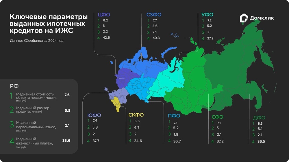 Итоги сезона на рынке ИЖС от Аналитического центра Домклик. Аналитический центр Домклик подвел итоги высокосезонного спроса на индивидуальное жилищное строительство (ИЖС). Эксперты отметили рост доли ИЖС на рынке загородной недвижимости: в 2022 году она составляла 43%, а в 2023 году выросла до 70%. За неполные десять месяцев 2023 года более 80% ипотечных сделок с загородной недвижимостью составляют сделки по ИЖС. С начала года было заключено около 80 тыс. ипотечных сделок на сумму 429,2 млрд рублей, что в 3,3 раза превышает показатели 2022 года. В первом полугодии спрос рос быстрыми темпами, достигнув рекордных 20,8 тыс. сделок в июне на пике льготной программы «Господдержка». После её завершения наблюдается сокращение спроса: в третьем квартале количество сделок снова вернулось к уровням 2022 года. Доля льготной ипотеки снизилась до 7% в сегменте ИЖС. В 2024 году растет интерес к регионам с программами «Дальневосточная и Арктическая ипотека», а также продолжает оставаться высокий спрос в крупнейших регионах, таких как Московская область и Краснодарский край. По данным Сбербанка, медианная стоимость недвижимости в сегменте ИЖС составляет 7,6 млн рублей. Наиболее высокие цены отмечены в Дальневосточном федеральном округе (8,3 млн рублей) и Центральном федеральном округе (8,2 млн рублей). Медианный размер кредита составляет 5,5 млн рублей, а первоначальный взнос — 2,1 млн рублей (около 27% от стоимости объекта). Ежемесячный платеж среднестатистически равен 39 тыс. рублей. Источник: www.sberbank.ru