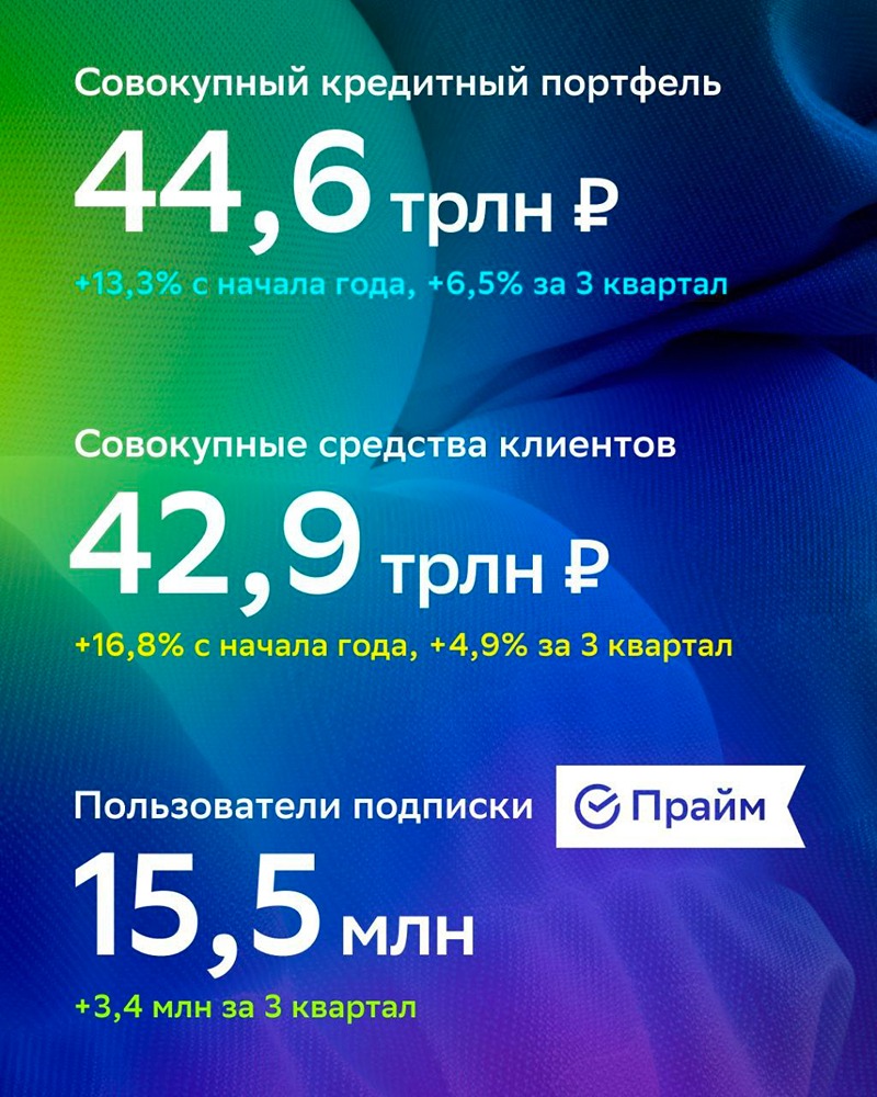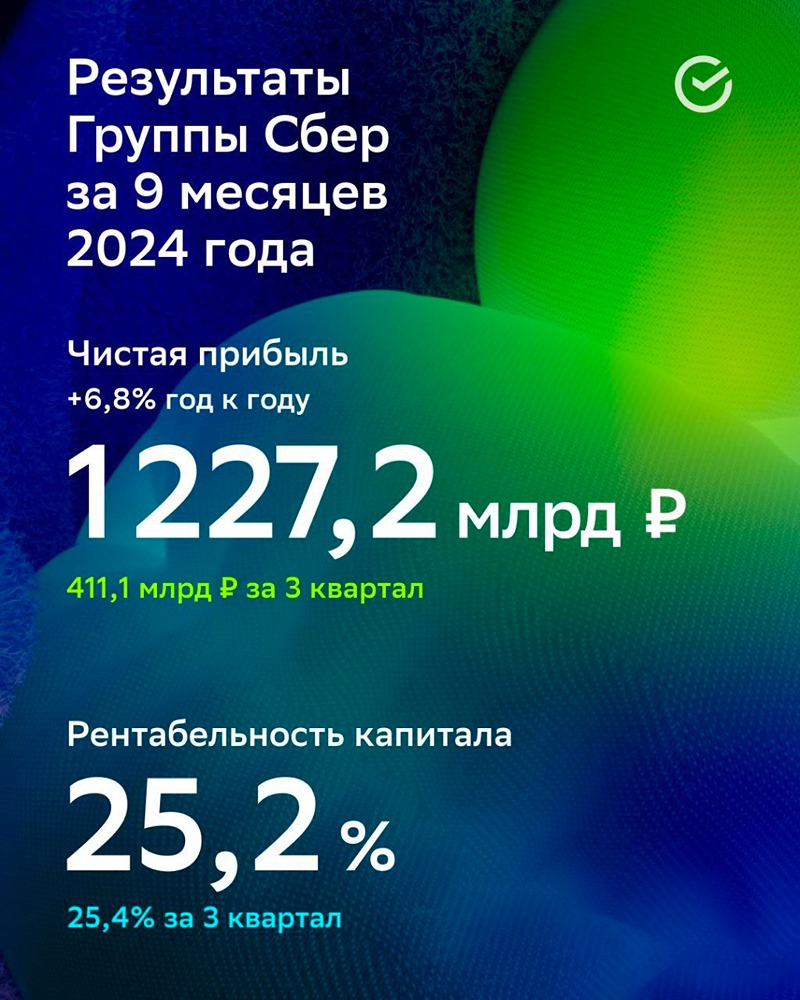 Сокращенные результаты МСФО за 9 месяцев 2024 года. Сбербанк (далее — «Группа» или «Сбер») опубликовал обобщенную промежуточную консолидированную финансовую отчетность в соответствии с международными стандартами финансовой отчетности (МСФО) (далее — «отчетность») за 9 месяцев 2024 года и по состоянию на 30 сентября 2024 года. Чистая прибыль Сбера за 9 месяцев 2024 года составила 1227 млрд руб. в соответствии с международными стандартами финансовой отчетности (МСФО). Герман Греф, Президент, Председатель Правления Сбербанка: За девять месяцев 2024 года чистая прибыль Сбера выросла на 6,8% год к году и составила 1,23 трлн рублей, рентабельность капитала превысила 25%. В отчетном квартале замедлилась потребительская активность клиентов и темпы роста розничного кредитования, при этом динамика кредитования корпоративных клиентов осталась на высоком уровне. Совокупный кредитный портфель увеличился на 6,5% за квартал до 44,6 трлн рублей. Средства клиентов превысили 42,9 трлн рублей и выросли на 4,9%: средства физических лиц увеличились на 2,8%, а корпоративных клиентов — на 8,6%. Продолжается рост вовлеченности клиентов и частота использования цифровых каналов Сбера. Количество розничных клиентов превысило 109,5 млн, из которых 89 млн получают выгоду от использования обновленной программы лояльности СберСпасибо, а более 17 млн могут оценить привилегии нашей флагманской подписки СберПрайм. В сентябре ей исполнилось четыре года, а количество подписчиков увеличилось на 3,4 млн за квартал благодаря улучшению условий по транзакционным сервисам. В октябре мы представили новую версию нейросетевой модели GigaChat MAX. AI-сервис теперь обладает более качественными экспертными знаниями в огромном диапазоне предметных областей, особенно в таких как биология, химия и физика, а также решение математических задач. Модель способна поддерживать контекст в многошаговых диалогах, а скорость ответов увеличилась в разы. Количество активных клиентов-физических лиц выросло на 1,0 млн с начала года до 109,5 млн человек. Количество активных ежемесячных пользователей (MAU) СберБанк Онлайн (app+web) увеличилось на 1,2 млн с начала года до 83,1 млн человек, а количество ежедневных пользователей (DAU) составило 43,7 млн человек. Показатель DAU/MAU — на уровне 52,6%. Количество участников программы лояльности СберСпасибо составило 89,0 млн и выросло на 11,8 млн за 9М 2024 г. Количество активных корпоративных клиентов составило 3,2 млн. Запущенная в текущем году программа лояльности «СберБизнес Спасибо» получила золотую награду в категории «Лучшая программа лояльности в сегменте B2B» национальной премии Loyalty Awards Russia 2024. Программа дает клиентам возможность накапливать бонусы, конвертировать их в рубли один к одному и возвращать до 100% стоимости покупок у партнеров Сбера. Программой пользуются уже 612 тыс. корпоративных клиентов по состоянию на конец 3 квартала 2024 г. Количество клиентов сервиса Сбер ID для входа и регистрации на сайтах и в приложениях Сбера и его партнёров выросло на 14,2 млн с начала года до 89,2 млн. Количество пользователей подписок СберПрайм увеличилось на 3,4 млн в 3 квартале и превысило 15,5 млн на фоне улучшения условий подписки по транзакционным сервисам. Уже более 2 млн детей в возрасте от 6 до 13 лет стали клиентами Сбера и могут оценить преимущества детских карт и приложения SberKids, а также детского образ