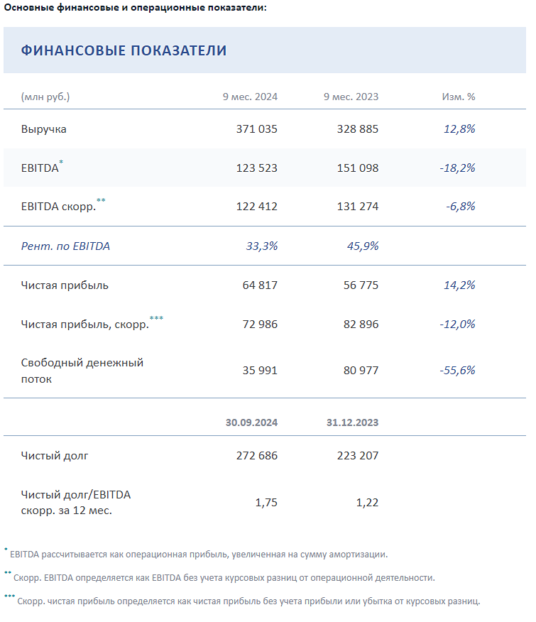ФосАгро публикует операционные и финансовые результаты за 9 месяцев 2024 г. Группа «ФосАгро» (далее «ФосАгро» или «Компания», тикер на Московской и Лондонской фондовых биржах: PHOR), российская вертикально-интегрированная компания, в состав которой входит один из крупнейших в мире производителей фосфорсодержащих минеральных удобрений, сегодня публикует операционные результаты и консолидированную промежуточную сокращенную финансовую отчетность за 9 месяцев, закончившихся 30 сентября 2024 года. Основные результаты за 9 месяцев 2024 г. За 9 месяцев 2024 года производство агрохимической продукции выросло на 2,4% к уровню прошлого года и составило 8,8 млн тонн. Основной прирост пришелся на увеличение производства фосфорных удобрений и кормовых фосфатов на 4,0% — до 6,7 млн тонн. Общие продажи агрохимической продукции за 9 месяцев 2024 года выросли на 4,1% к аналогичному периоду прошлого года и превысили 9 млн тонн. При этом рост реализации фосфорсодержащих удобрений и кормовых фосфатов составил 5,9%. Выручка за 9 месяцев 2024 года составила 371,0 млрд рублей, увеличившись на 12,8% к уровню аналогичного периода прошлого года на фоне роста объемов производства и реализации товарной продукции. За 9 месяцев 2024 года EBITDA компании составила 123,5 млрд рублей, снизившись на 18,2% к показателю аналогичного периода прошлого года. Свободный денежный поток по итогам 9 месяцев 2024 года составил почти 36,0 млрд руб. Чистый долг по состоянию на 30 сентября 2024 года составил 272,7 млрд рублей. Соотношение чистого долга к показателю EBITDA на конец отчетного периода составило комфортные 1,75х. Выручка компании за 9 месяцев 2024 года выросла к уровню прошлого года на 12,8%. Рост выручки был связан в основном с увеличением объемов производства и продаж фосфорных удобрений (в основном NPK), на фоне восстановления с начала года средних цен реализации на глобальных рынках. EBITDA компании по итогам 9 месяцев составила 123,5 млрд руб. На динамику показателя относительно аналогичного периода прошлого года положительно повлияли рост объемов и цен реализации, а также положительный эффект от курсовых разниц. В то же время данный показатель находился под давлением таких факторов, как рост себестоимости на фоне уплаты введенных с 2023 года экспортных пошлин, рост потребления сырьевых ресурсов и увеличение расходов на персонал. Доходность по EBITDA за 9 месяцев 2024 года составила 33,3%. Такой уровень доходности был обеспечен высокой эффективностью производственных активов компании, ростом производства высокомаржинальных видов удобрений, увеличением выпуска основных сырьевых ресурсов и гибкой сбытовой политикой компании. Свободный денежный поток (FCF) за 9 месяцев 2024 года составил почти 36,0 млрд руб. На величину показателя в 2024 году оказали влияние плановый рост уровня капиталовложений (связанный с реализацией крупных инвестиционных проектов) и отток денежных средств в третьем квартале на формирование оборотного капитала в размере 18,5 млрд руб. (на фоне роста отгрузок в страны Латинской Америки и формирования складских запасов продукции в преддверии начала сезонного спроса на рынках России и Европы). Устойчивое финансовое положение позволяет компании своевременно и в полном объеме обслуживать все свои долговые обязательства, в том числе номинированные в иностранной валюте. На конец 9 месяцев 2024 года долговая на