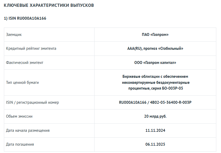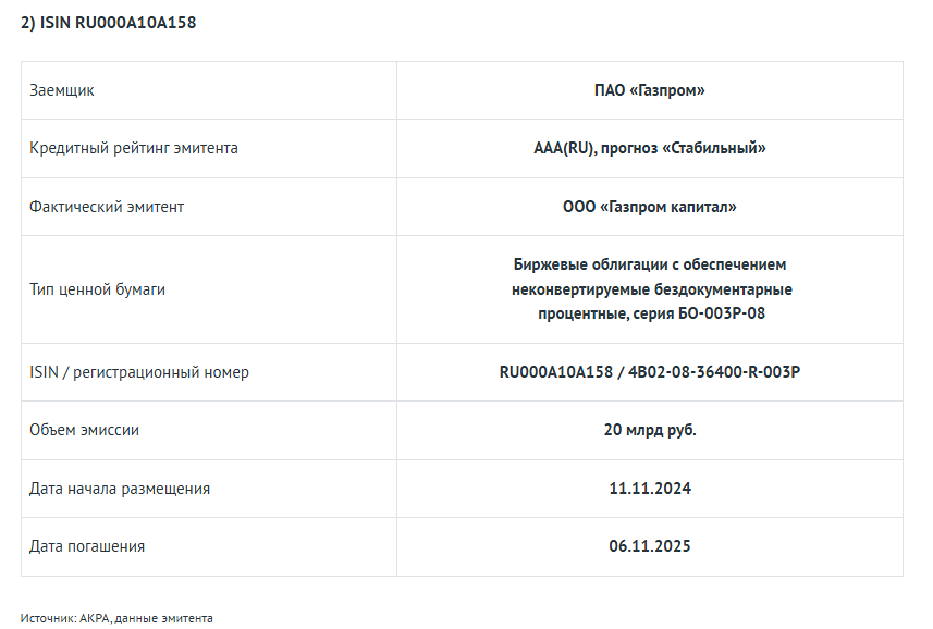 Агентство кредитных рейтингов АКРА присвоило выпускам облигаций ООО «Газпром Капитал» серий БО-003Р-05 (RU000A10A166) и БО-003Р-08 (RU000A10A158) кредитный рейтинг AAA(RU). Обоснование кредитного рейтинга. Поручителем по выпускам облигаций ООО «Газпром капитал» серий БО-003Р-05 и БО-003Р-08 является ПАО «Газпром» (далее — ПАО «Газпром», Компания, Группа; рейтинг АКРА — AAA(RU), прогноз «Стабильный»). По причине отсутствия структурной и контрактной субординации выпусков АКРА оценивает эти облигации как равные по очередности исполнения другим существующим и будущим необеспеченным и несубординированным обязательствам ПАО «Газпром». В соответствии с методологией АКРА применяется упрощенный подход, согласно которому кредитный рейтинг эмиссий приравнивается к кредитному рейтингу ПАО «Газпром» и устанавливается на уровне AАА(RU). Кредитный рейтинг ПАО «Газпром» обусловлен очень высокой оценкой поддержки Компании со стороны государства. Собственная кредитоспособность Компании определяется с учетом очень сильного бизнес-профиля, низкого отраслевого риска и сильного финансового профиля. ПАО «Газпром» — одна из крупнейших мировых интегрированных энергетических компаний, занимающая первое место в мире по объемам добычи газа. Группа входит в число крупнейших производителей нефти в России (посредством ПАО «Газпром нефть», рейтинг АКРА — ААА(RU), прогноз «Стабильный»). ПАО «Газпром» владеет крупными энергогенерирующими активами (через ООО «Газпром энергохолдинг»). Группе Газпром также принадлежит газотранспортная система протяженностью 180,6 тыс. км. Кредитный рейтинг выпускам облигаций ООО «Газпром капитал» серий БО-003Р-05 (RU000A10A166) и БО-003Р-08 (RU000A10A158) был присвоен по национальной шкале для Российской Федерации на основе Методологии присвоения кредитных рейтингов финансовым инструментам по национальной шкале для Российской Федерации, а также Основных понятий, используемых Аналитическим Кредитным Рейтинговым Агентством в рейтинговой деятельности. Кредитный рейтинг был присвоен облигациям ООО «Газпром капитал» серий БО-003Р-05 (RU000A10A166) и БО-003Р-08 (RU000A10A158) впервые. Пересмотр кредитного рейтинга ожидается в течение одного года с даты опубликования настоящего пресс-релиза. Кредитный рейтинг был присвоен на основании данных, предоставленных ПАО «Газпром» и ООО «Газпром капитал», информации из открытых источников, а также баз данных АКРА. Кредитный рейтинг является запрошенным, ПАО «Газпром» и ООО «Газпром капитал» принимали участие в процессе присвоения кредитного рейтинга. При присвоении кредитного рейтинга использовалась информация, качество и достоверность которой, по мнению АКРА, являются надлежащими и достаточными для применения методологий. АКРА оказывало ПАО «Газпром» дополнительные услуги. АКРА не оказывало ООО «Газпром капитал» дополнительных услуг. Конфликты интересов в рамках процесса присвоения кредитного рейтинга выявлены не были. Источник: www.acra-ratings.ru
