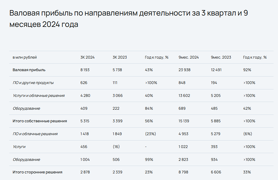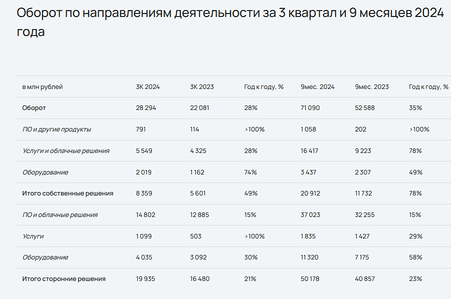 ПАО «СОФТЛАЙН» сообщает о росте чистой прибыли до 2 млрд рублей по итогам 3 квартала 2024 года и подтверждает прогноз роста компании на 2024 год. ПАО «Софтлайн» (Компания или Группа, MOEX:SOFL), ведущий поставщик решений и сервисов в области цифровой трансформации и информационной безопасности, развивающий комплексный портфель собственных продуктов и услуг, объявляет неаудированные консолидированные финансовые результаты ПАО «Софтлайн» по МСФО за 3 квартал и 9 месяцев 2024 года. По итогам 3 квартала 2024 года: Оборот Компании достиг 28,3 млрд рублей, увеличившись на 28% по сравнению с показателем, зафиксированным по итогам 3 квартала 2023 года. В структуре оборота практически треть показателя пришлась на оборот от продажи собственных решений Группы. Валовая прибыль увеличилась на 43% год к году и составила 8,2 млрд рублей. Доля валовой прибыли, полученной Группой от продажи высокорентабельных решений собственного производства, составила 65%. В результате валовая рентабельность Компании достигла 29% (+3 п.п. г/г). Скорректированная EBITDA выросла более чем двукратно – до 1,2 млрд рублей в 3 квартале 2024 года. Чистая прибыль за отчетный период превысила 2 млрд рублей после убытка годом ранее. Количество инженеров и разработчиков в составе общей численности сотрудников по состоянию на 30 сентября 2024 года превысило 6,2 тыс. человек, подчеркивая проводимую Компанией трансформацию бизнеса. Количество сотрудников превысило 11 тыс. человек. В результате, за 9 месяцев 2024 года ПАО «Софтлайн» удалось достичь следующих финансовых результатов: Оборот Группы за 9 месяцев 2024 года увеличился на 35% год к году до 71,1 млрд рублей. Около 29% показателя пришлось на оборот от продажи собственных решений Компании. Валовая прибыль в отчетном периоде возросла более чем на 90% до 23,9 млрд рублей. Валовая прибыль, полученная от собственных решений Группы, в отчетном периоде увеличилась более чем в 2 раза и составила 15,1 млрд рублей – это более 63% от общей валовой прибыли Компании. В результате валовая рентабельность Группы за 9 месяцев 2024 года достигла 33,7% (+9,9 п.п. г/г). Скорректированная EBITDA Компании за 9 месяцев 2024 года увеличилась более чем в 2 раза по сравнению с показателем, зафиксированным по итогам 9 месяцев 2023 года, до 4,6 млрд рублей. Чистая прибыль Группы за обозначенный период превысила 1,5 млрд рублей. Владимир Лавров, CEO ПАО «Софтлайн»: «ПАО «Софтлайн» продолжает следовать своей четко выстроенной стратегии роста, направленной на укрепление лидерских позиций Компании и создание стоимости для акционеров, и мы стабильно фиксируем двузначные темпы роста оборота Группы по всем основным видам деятельности. Особое внимание мы, согласно нашей стратегии, уделяем развитию портфеля собственных решений. Это связано с тем, что такой подход обеспечивает рост рентабельности бизнеса. Так, по итогам 9 месяцев 2024 года, валовая рентабельность собственных решений достигла 72%. В свою очередь, наши цели по росту показателей от реализации продуктов и услуг собственного производства мы стабильно выполняем. За 9 месяцев 2024 года оборот от продажи собственных решений вырос на 78%, а доля валовой прибыли, полученной от реализации решений собственного производства Компании, превысила 63% в общей валовой прибыли. Таких результатов нам удается достичь, в том числе, за счет активной M&A-стратегии. Компании, которые мы
