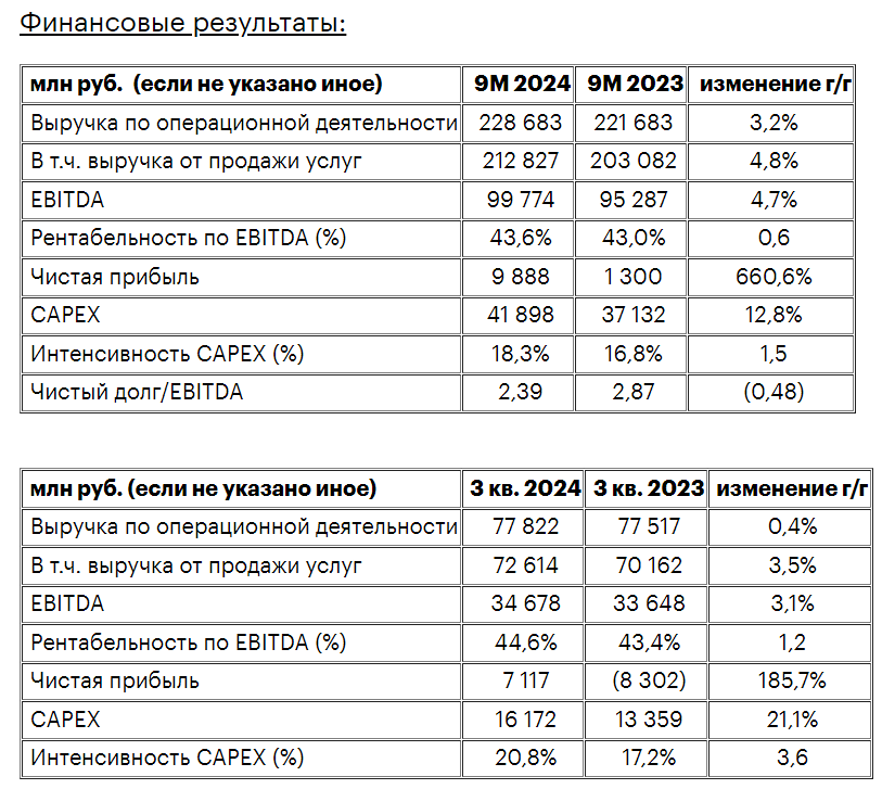 «Билайн» делится информацией о своих достижениях за третий квартал и первые девять месяцев 2024 года. ПАО «ВымпелКом», одна из крупнейших телекоммуникационных компаний в России, объявляет результаты деятельности за третий квартал и девять месяцев 2024 года. Основные финансовые показатели за девять месяцев 2024 года: Выручка по операционной деятельности за девять месяцев 2024 года выросла на 3,2% к аналогичному периоду прошлого года и достигла 228,7 млрд руб. В том числе, выручка от продажи услуг (сервисная выручка) увеличилась на 4,8% до 212,8 млрд руб. EBITDA за девять месяцев 2024 года выросла на 4,7% г/г до 99,8 млрд руб. Увеличение EBITDA произошло главным образом за счёт роста выручки от продажи услуг (сервисной выручки). Рентабельность по EBITDA увеличилась на 0,6 п.п. и достигла 43,6% благодаря опережающему росту выручки над операционными расходами. В третьем квартале 2024 года рентабельность по EBITDA достигла 44,6%. Чистая прибыль за девять месяцев выросла до 9,9 млрд руб. Кроме перечисленных выше факторов на динамику чистой прибыли оказало влияние увеличение финансовых доходов от вложений в финансовые активы, а также разовые факторы. Интенсивность капиталовложений выросла на 1,5 п.п. и составила 18,3% от выручки. С учётом различий в графике реализации проектов внутри года, уровень интенсивности остаётся стабильным по сравнению с прошлым годом. Несмотря на существенный рост процентных ставок и негативную конъюнктуру на российском долговом рынке, долговая нагрузка (отношение чистого долга к EBITDA) компании снизилась на 0,48 год к году и составила 2,39, а средневзвешенная процентная ставка по состоянию на 30 сентября 2024 года осталась на уровне 9,99%. Наши долговые обязательства имеют комфортный график погашения, который равномерно распределен вплоть до 4 квартала 2031 года, а также долгосрочный характер. Первые погашения ожидаются не ранее чем через 12 месяцев после отчетной даты. Ключевые события отчетного периода: Телекоммуникационный бизнес. В третьем квартале билайн продолжил совершенствовать сервис защиты от мошенников «Моя безопасность», расширив его действие с голосовых вызовов на звонки в таких популярных мессенджерах как Telegram и Whatsapp. В августе билайн начал предлагать своим клиентам детские сим-карты с бесплатной защитой от спама и мошенников, а также гибкими тарифами, которые позволяют родителям управлять объемом минут и гигабайт. Количество звонков с нашим корпоративным сервисом идентификации вызовов «Этикетка» в третьем квартале выросло до 240 млн, а количество клиентов превысило 1340. Обращаемость в службу поддержки по теме телефонного мошенничества среди клиентов старше 60 лет снизилась в пять раз за последние 6 месяцев. В июле на национальной премии Loyalty & CX Awards Russia билайн победил в номинации «Контактный центр 2024 года». Также члены экспертного жюри по достоинству оценили Группу быстрого реагирования для борьбы с мошенничеством, которую Билайн запустил первым среди телеком-операторов в России. Компания приняла решение о дальнейшем развитии показателя CLTV и расширении его базы расчёта и области применения на корпоративный бизнес. Публикация показателя планируется в 2025г. Цифровые нетелеком сервисы. Облачные продукты и сервисы кибербезопасности. За девять месяцев 2024 года наш бизнес в сегменте облачных продуктов и сервисов кибербезопасности вырос на 27,3% 