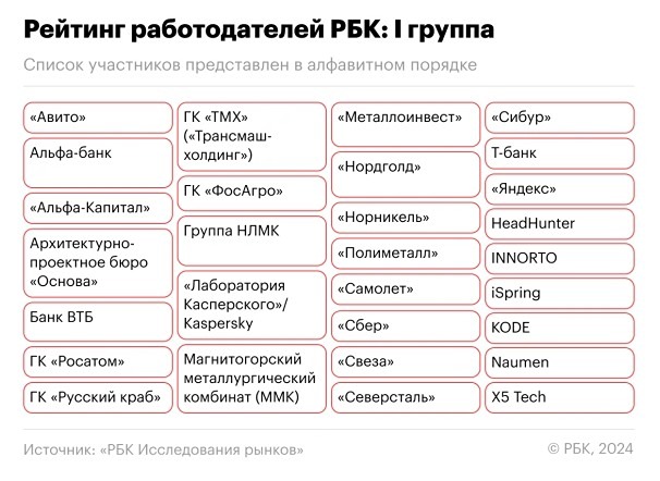 Нехватка кадров и рост зарплат: результаты Рейтинга работодателей РБК 2024 года. Российские компании проявляют серьезный интерес к улучшению условий труда и установлению эффективного взаимодействия между сотрудниками и руководством. Это основной вывод, сделанный создателями нового Рейтинга работодателей РБК. Методика формирования рейтинга. 19 ноября на десятом HR-форуме РБК был представлен рейтинг ведущих работодателей России за 2024 год, подготовленный аналитиками «РБК Исследования рынков». HR-специалисты из ведущих компаний оценивали участников по более чем 30 показателям, сгруппированным в пять ключевых категорий: - Условия труда и уровень заработной платы - Эффективность бизнеса и инновационное развитие - Социальная ответственность - Деловая репутация - Мнение сотрудников о работодателе Сбор информации проходил с июля по октябрь 2024 года. Участники рейтинга самостоятельно определяли вес каждой группы критериев, что обеспечивало объективность итогов. Наиболее значимой была признана категория, касающаяся условий труда, включая уровень заработной платы, возможности профессионального роста и социальные льготы. Эта группа показателей получила почти максимальный вес в 7 баллов. Социальная ответственность бизнеса оказалась наименее важной, с усредненной оценкой 5,6 балла. Таким образом, можно сделать вывод, что ведущие компании в России ориентированы на создание комфортных условий труда, достойную заработную плату и возможность обратной связи с руководством. Участники рейтинга. В этом году в рейтинге приняли участие 206 компаний, в которых работают более 2,6 миллиона человек. Опрос для оценки работодателей охватил около 88 тысяч сотрудников. Средняя заработная плата участников рейтинга составила около 155 тысяч рублей в месяц, что на 75% превышает среднероссийский уровень за 2024 год по данным Росстата. Размеры зарплат варьируются в зависимости от компании, но различия незначительны. Минимальная зарплата — 143 533 рубля — была зарегистрирована в фирмах с преобладанием линейного персонала. Средняя заработная плата участников рейтинга за год увеличилась на 22%. Наибольший рост наблюдался в сферах розничной торговли, телекоммуникации, b2b-услуг и производства, что отражает общую ситуацию на российском рынке труда, где главной проблемой является нехватка работников. Как использовать рейтинг. Рейтинг работодателей РБК разделен на три группы. Победителями стали компании из Группы I. Компании в каждой из трех групп представлены в алфавитном порядке и равны друг другу по статусу; их порядок определяется исключительно алфавитом. Важно отметить, что размеры бизнеса не влияют на результаты рейтинга: в одной группе могут соседствовать как небольшие организации, так и крупные холдинги. Источник: www.rbc.ru