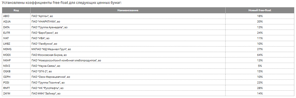 Новые базы расчета индексов Московской Биржи. Московская Биржа по рекомендации Индексного комитета сформировала базы расчета индексов акций, которые будут действовать с 20 декабря 2024 года, а также установила значения коэффициентов free-float и дополнительных ограничительных весовых коэффициентов для ценных бумаг ряда эмитентов. В базу расчета Индекса МосБиржи и Индекса РТС войдут обыкновенные акции МКПАО "Хэдхантер", обыкновенные акции ПАО "Совкомбанк" и обыкновенные акции ПАО "ЮГК", тогда как депозитарные расписки Ozon Holdings PLC будут исключены из индекса. В базу расчета Индекса голубых фишек будут включены обыкновенные акции ПАО Московская Биржа и обыкновенные акции МКПАО "Хэдхантер", при этом обыкновенные акции ПАО "ММК" и обыкновенные акции ПАО "Магнит" покинут индекс. База расчета Индекса средней и малой капитализации изменится за счет включения обыкновенных акций ПАО "Софтлайн", обыкновенных акций ПАО "ПРОМОМЕД" и обыкновенных акций ПАО "Россети Урал", а также исключения депозитарных расписок ETALON GROUP PLC. В базу расчета Индекса акций широкого рынка войдут обыкновенные акции ПАО "Совкомбанк", обыкновенные акции ПАО "Группа Аренадата", обыкновенные акции ПАО "Озон Фармацевтика", обыкновенные акции ПАО "СПБ Биржа" и обыкновенные акции ПАО "ИВА". При этом депозитарные расписки Ozon Holdings PLC и депозитарные расписки ETALON GROUP PLC покинут индекс. Отраслевой Индекс информационных технологий изменится за счет включения обыкновенных акций ПАО "Группа Аренадата" и обыкновенных акций ПАО "ИВА", а также исключения депозитарных расписок Ozon Holdings PLC. Обыкновенные акции ПАО "Озон Фармацевтика" войдут в отраслевой Индекс потребительского сектора. Обыкновенные акции ПАО "Совкомбанк" и обыкновенные акции ПАО "СПБ Биржа" будут включены в отраслевой Индекс финансов. Депозитарные расписки ETALON GROUP PLC покинут отраслевой Индекс недвижимости. В лист ожидания на включение в базу расчета Индекса МосБиржи и Индекса РТС войдут обыкновенные акции ПАО "ЭсЭфАй", обыкновенные акции МКПАО "МД Медикал Груп", обыкновенные акции Группа Ренессанс Страхование и обыкновенные акции ПАО "НК "РуссНефть". Обыкновенные акции ПАО "Магнит", обыкновенные акции ПАО "ЛК "Европлан", обыкновенные акции ПАО "ГК "Самолет" и привилегированные акции ПАО "Мечел" войдут в лист ожидания на исключение из базы расчета Индекса МосБиржи и Индекса РТС. Источник: www.moex.com