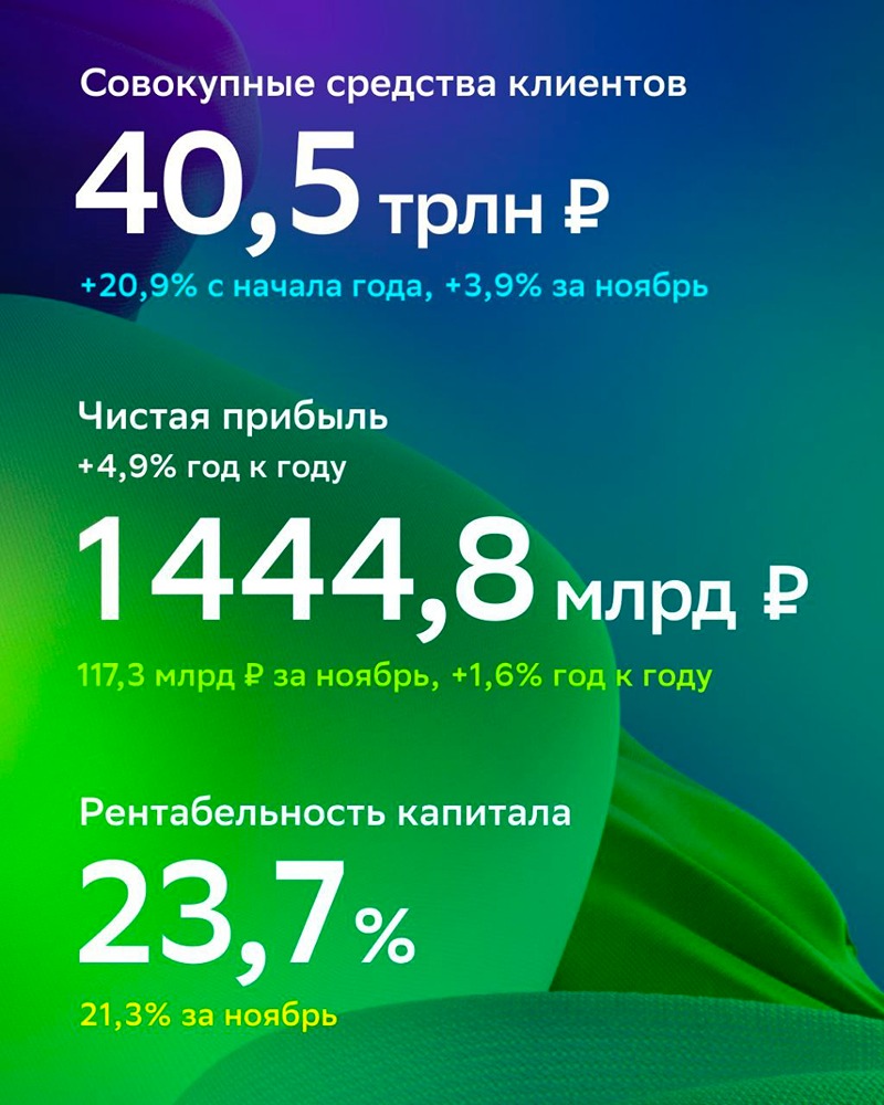 Сокращенные результаты ПАО Сбербанк по РПБУ за 11 месяцев 2024 года. Герман Греф, Президент, Председатель Правления Сбербанка: За 11 месяцев 2024 года чистая прибыль ПАО Сбербанк увеличилась на 4,9% в годовом выражении до 1 445 млрд рублей, рентабельность капитала составила 23,7%. Замедление темпов роста кредитования сохраняется под влиянием высоких ставок в экономике и усиления регулирования. В ноябре выдачи кредитов физическим лицам снизились до 327 млрд рублей, а прирост розничного портфеля составил 0,5% за месяц. Мы видим снижение спроса и со стороны корпоративных заемщиков по сравнению с третьим кварталом этого года. Кредитный портфель в этом сегменте вырос на 1,0% за месяц в реальном выражении и превысил 28 трлн рублей. В условиях возросшей стоимости финансирования основной акцент – на предоставлении кредитов высококачественным заемщикам. Количество розничных клиентов выросло на 1,3 млн человек с начала года до 109,9 млн человек. Число активных корпоративных клиентов – 3,2 млн компаний. Число активных ежемесячных пользователей (MAU) СберБанк Онлайн (app + web) составило 83,2 млн человек, а количество ежедневных пользователей (DAU) выросло до 44,0 млн человек. Показатель DAU/MAU составил 53%. Детскими СберКартами пользуются уже 4,7 млн детей в возрасте от 6 до 13 лет. MAU мобильного приложения СберKids – 2,1 млн пользователей. Ребёнок может легко оплачивать покупки и получать за них бонусы «Спасибо». Кроме того, приложение является образовательным порталом, где дети могут повышать свою финансовую грамотность. Количество участников программы лояльности СберСпасибо выросло на 13,8 млн с начала года и превысило 91 млн клиентов. Число подписчиков СберПрайм выросло на 8,4 млн с начала года до 18,4 млн человек на конец ноября 2024 года. С ноября подписчики СберПрайм получают дополнительную выгоду при открытии накопительного счёта в Сбере — ставка по вкладу для них увеличена на 2 пп. Розничный кредитный портфель вырос на 0,5% за месяц и на 12,5% с начала года до 17,5 трлн руб. Частным клиентам в ноябре было выдано 327 млрд руб. кредитов. Портфель жилищных кредитов вырос на 8,3% с начала года или на 0,6% за месяц на фоне утилизации ранее полученных лимитов по семейной ипотеке и составил 11,0 трлн руб. В ноябре банк выдал 168 млрд руб. ипотечных кредитов. Портфель потребительских кредитов вырос на 4,0% с начала года до 4,0 трлн руб. Потребительское кредитование в ноябре оставалось под давлением высоких ставок в экономике и усиления регуляторного контроля. В ноябре портфель потребительских кредитов снизился 2,1%, а выдачи составили 89 млрд руб. Портфель кредитных карт прибавил 3,0% за месяц или 42,5% с начала года, а объем портфеля составил 2,3 трлн руб. Корпоративный кредитный портфель увеличился на 2,4% за месяц (+1,0% без учета валютной переоценки) и составил 28,1 трлн руб. С начала года портфель вырос на 20,7% (+17,0% без учета валютной переоценки). За месяц корпоративным клиентам было выдано 1,6 трлн руб. кредитов. Качество кредитного портфеля остается стабильным. Доля просроченной задолженности изменилась незначительно и составила 2,2%. Средства физических лиц превысили 26,9 трлн руб. и выросли на 1,3% за месяц (+0,7% без учета валютной переоценки). С начала года рост клиентских средств составил 18,8% (+16,9% без учета валютной переоценки). Средства юридических лиц выросли на 9,2% за месяц и превысили 13,6 трлн руб. (+7,3% без учета вал