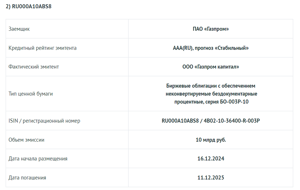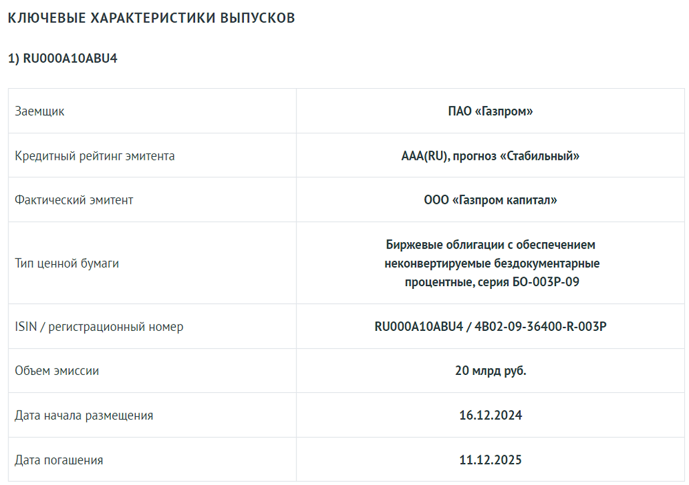 АКРА присвоило кредитный рейтинг выпускам облигаций «Газпром капитала». АКРА присвоило кредитный рейтинг выпускам облигаций ООО «Газпром капитал» серий БО-003Р-09 (RU000A10ABU4), БО-003Р-10 (RU000A10ABS8), БО-003Р-11 (RU000A10ABT6), БО-003Р-12 (RU000A10ABV2). Поручителем по этим выпускам облигаций является ПАО «Газпром» (далее — Компания, Группа; рейтинг АКРА — AAA(RU), прогноз «Стабильный»). Поскольку выпуски не имеют структурной и контрактной субординации, АКРА рассматривает их как равные по приоритету исполнения другим существующим и будущим необеспеченным и несубординированным обязательствам ПАО «Газпром». В соответствии с методологией АКРА применяется упрощённый подход, согласно которому кредитный рейтинг выпусков приравнивается к кредитному рейтингу ПАО «Газпром» и устанавливается на уровне AАА(RU). Кредитный рейтинг ПАО «Газпром» обусловлен очень высокой оценкой поддержки со стороны государства. Собственная кредитоспособность Компании определяется с учётом очень сильного бизнес-профиля, низкого отраслевого риска и сильного финансового профиля. ПАО «Газпром» — одна из крупнейших мировых интегрированных энергетических компаний, занимающая первое место в мире по объёмам добычи газа. Группа входит в число крупнейших производителей нефти в России (через ПАО «Газпром нефть», рейтинг АКРА — ААА(RU), прогноз «Стабильный»). ПАО «Газпром» владеет крупными энергогенерирующими активами (через ООО «Газпром энергохолдинг»). Группе Газпром также принадлежит газотранспортная система протяжённостью 180,6 тыс. км. Кредитный рейтинг был присвоен впервые. Пересмотр рейтинга ожидается в течение года с даты публикации данного пресс-релиза. Кредитный рейтинг был присвоен на основе данных, предоставленных ПАО «Газпром» и ООО «Газпром капитал», информации из открытых источников и баз данных АКРА. Рейтинг является запрошенным, ПАО «Газпром» и ООО «Газпром капитал» принимали участие в процессе его присвоения. АКРА не оказывало ПАО «Газпром» дополнительных услуг. ООО «Газпром капитал» не получало дополнительных услуг от АКРА. Конфликты интересов в процессе присвоения кредитного рейтинга не выявлены. Источник: www.acra-ratings.ru