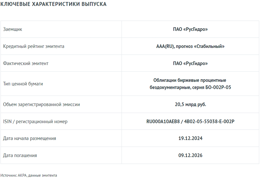 АКРА присвоило кредитный рейтинг AAA(RU) выпуску облигаций ПАО «РусГидро» серии БО-002Р-05 (RU000A10AEB8)
