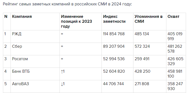ОАО «РЖД» и Сбер в 2024 году стали лидерами по упоминаемости в СМИ, опередив другие компании. ОАО «РЖД» освещалось в связи с заявлением президента Владимира Путина о готовности к строительству ВСМ между Москвой и Санкт-Петербургом и чрезвычайными ситуациями с поездами. Совет директоров одобрил продажу здания Рижского вокзала и приобретение небоскрёба Moscow Towers. Сбер провёл Международную конференцию AI Journey, где обсуждались технологии искусственного интеллекта и машинного обучения. Путин осмотрел инновационные устройства: камеру для отслеживания состояния организма и кольцо для сбора биометрических данных. Сбер также открыл первые офисы в ЛНР и ДНР и оказал помощь пострадавшим от теракта. Третье место занял «Росатом». Лихачёв обсудил с Путиным текущую работу корпорации и выполнение ГОЗ. Путин и президент Египта приняли участие в церемонии заливки бетона на египетской АЭС «Эль-Дабаа». ВТБ занял четвёртое место. Он провёл XV инвестиционный форум «Россия зовёт!» с участием Путина и почти двух тысяч участников. ВТБ объявил о намерении удвоить доступность финансовых продуктов и услуг до 100 миллионов человек к 2026 году. Пятое место занял «АвтоВАЗ». Компания планирует выпускать 70–100 тысяч автомобилей Lada Iskra в год и начать производство бизнес-седана LADA Aura и новых версий LADA Largus. Источник: www.interfax.ru
