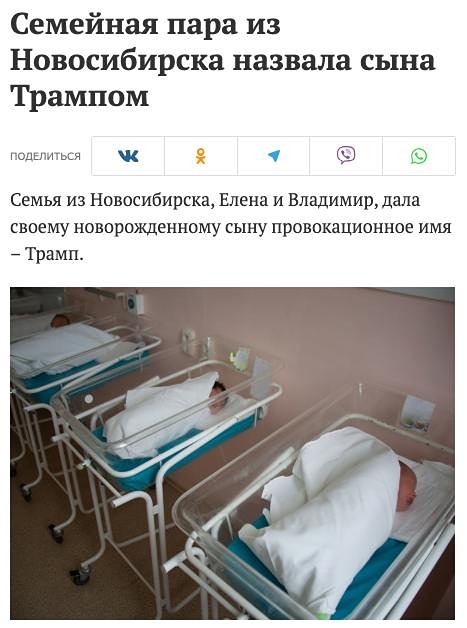 Семья из Новосибирска, переехавшая в Белоруссию, решила назвать своего новорождённого сына Трампом. Отчество мальчика — Владимирович. Отец малыша объяснил, что выбор имени не связан с политикой, а обусловлен его необычностью.