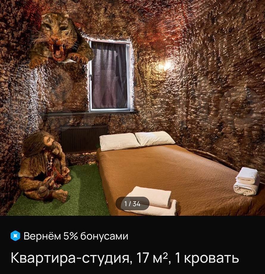 В Москве можно арендовать на сутки квартиру-студию в стиле пещеры. Интерьер выполнен в духе жилища первобытного человека. В распоряжении гостей кровать, скульптура саблезубого тигра, очаг и манекен кроманьонца.
