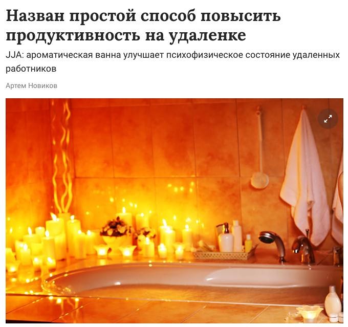 Ученые утверждают, что один из самых эффективных способов борьбы с выгоранием — это ароматические ванны с эфирными маслами. Исследователи из Японии выяснили, что такие процедуры значительно улучшают физическое и психическое состояние работников, особенно тех, кто трудится удаленно. Всего через 10 минут после ванны у человека улучшается настроение и повышается активность, а спустя четыре недели снижается уровень стресса и повышается производительность труда.