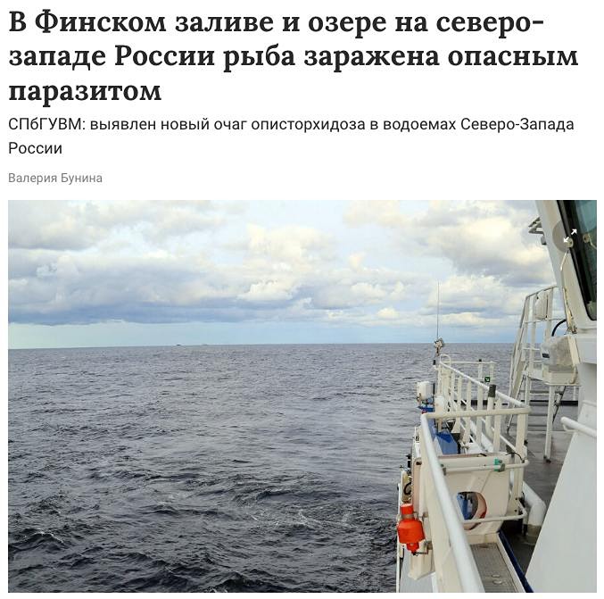 В рыбе из Финского залива и озера Ильмень обнаружен опасный паразит — возбудитель описторхоза. Этот паразит способен поражать печень и поджелудочную железу, жить в организме до 30 лет и вызывать серьёзные осложнения. Чаще всего заражаются уклейка, язь, плотва, краснопёрка, лещ и синец. Учёные обнаружили новые очаги инфекции, но уверяют, что заражённая продукция не попадает на рынок.